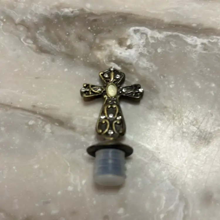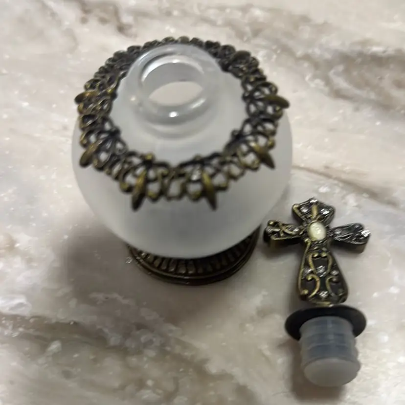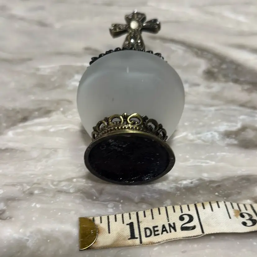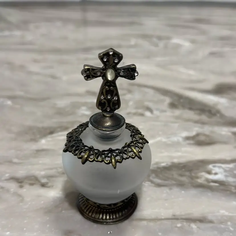 Very cute glass perfume bottle. Unbranded no chips or cracks. Mixture of glass and metal. 4” high widest part is 3”.