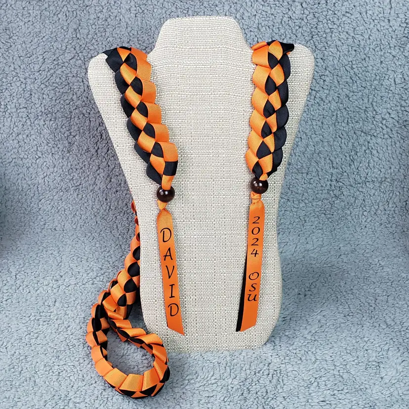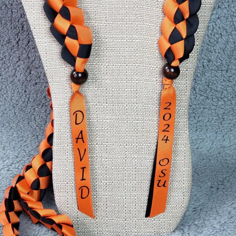 One (1) Personalize Custom Color Hawaiian Graduation 2-Ribbon Stole (Choose Colors, Name, Year, School Initials). See Photo for Color Chart. Approximately: 1 1/2 inches wide. 31 inches long. Wooden Beads. Message me your customizations. If you don't see your ribbon color let me know.
