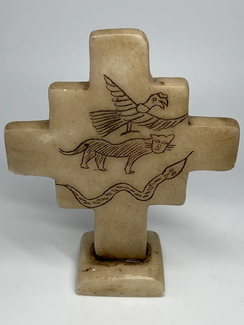 Embrace the rich cultural heritage of Peru with this intricately hand-carved Inca Calendar/Chakana Andean Cross. Standing at 5.5 inches tall and spanning 4.25 inches wide, this piece is a magnificent testament to the skilled artisanship and time-honored traditions of the Peruvian people. Each detail of the Chakana is meticulously sculpted, offering a profound connection to the ancestral rhythms and an homage to the celestial cycles. This beautiful work of art is a versatile addition to any collection, sure to elevate any space with its historical significance and intricate design.