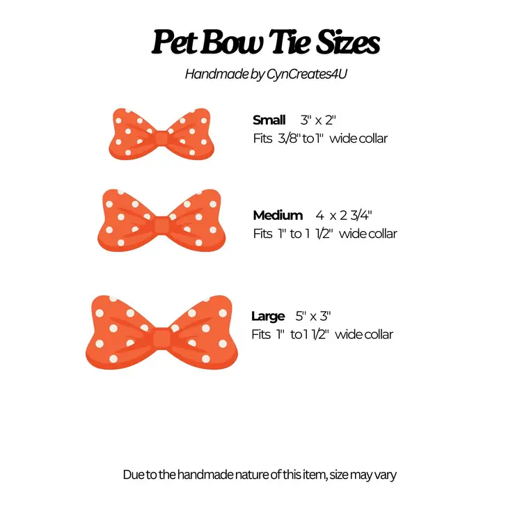 Available in 3 sizes - Small, Medium, or Large. Sizes are approximate. There is a size chart attached in the photos that shows the size of the bow and the width of the collar it can be attached to.