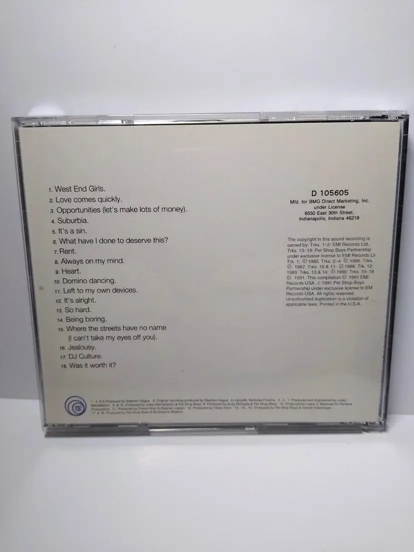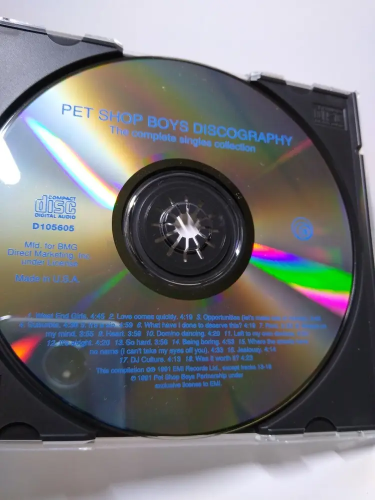 Artist: Pet Shop Boys CD Grading: Excellent (EX) Record Label: EMI Release Title: Pet Shop BoysDiscography (The Complete Singles Collection) Case Type: Jewel Case: Standard Color: Silver Custom Bundle: No Case Condition: Very Good Plus (VG+) MPN: D105605 Inlay Condition: Very Good Plus (VG+) Edition: 1st Edition Modified Item: No Brand: BMG Type: Album Format: CD Language: English Release Year: 1991 Era: 1980s Style: 1980s Features: Original Cover Genre: Dance & Electronica, Pop Country/Region of Manufacture: United States