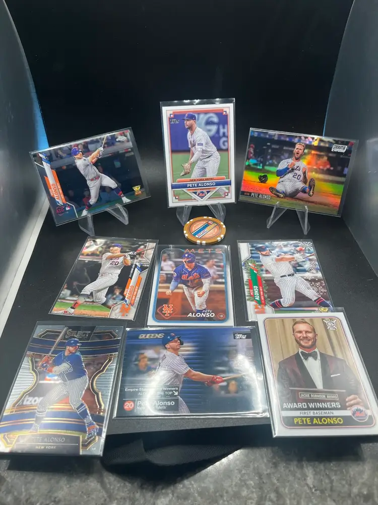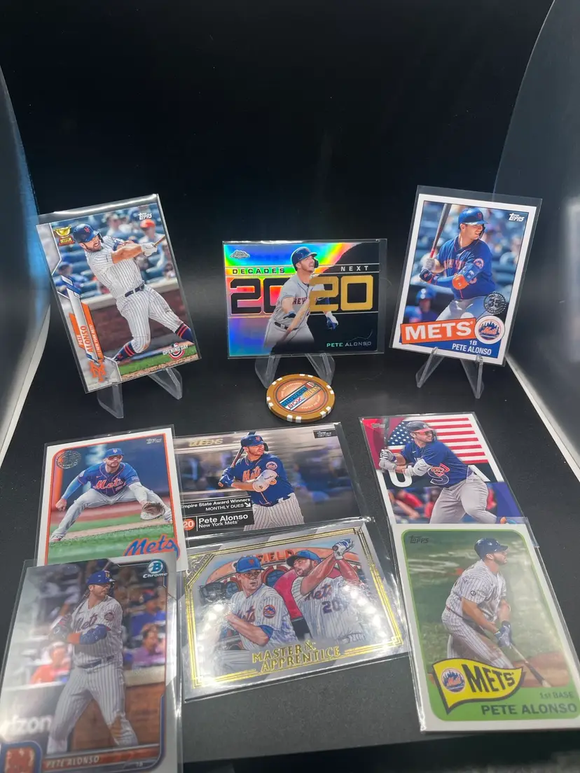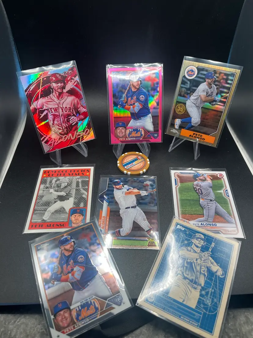 Pete Alonso lot. 25 cards. Includes pink topps chrome, Red fire parallel, flagship stock edition, Stadium Club SP refractor, etc.