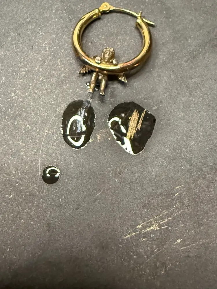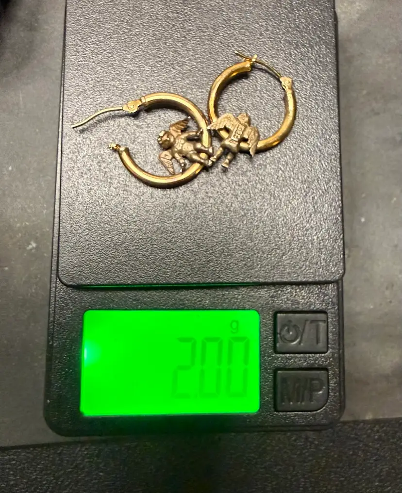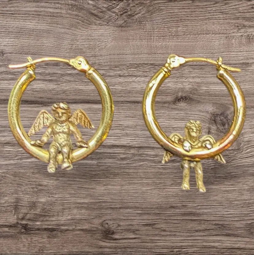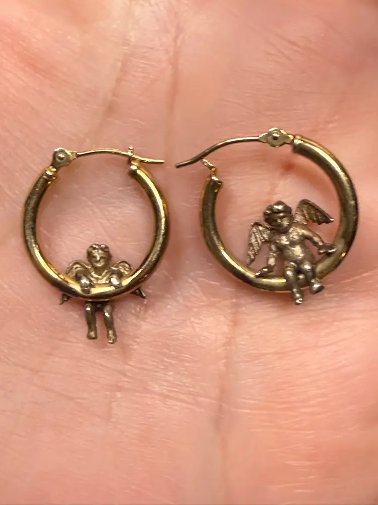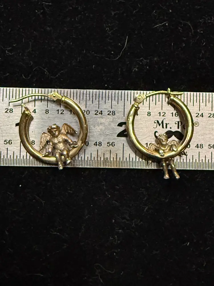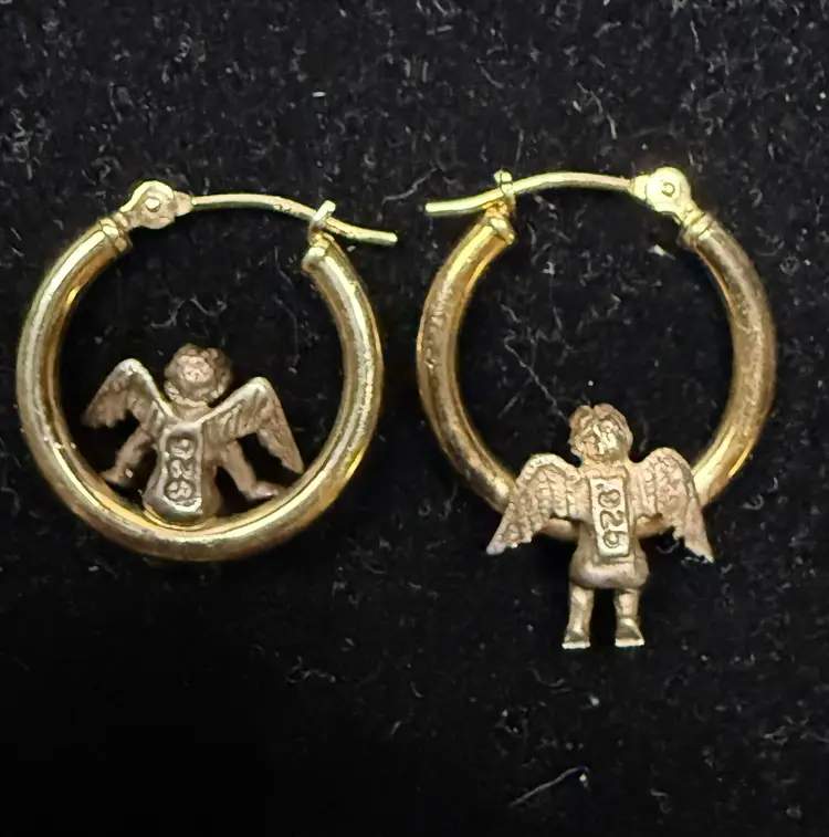 These Peter Brams 14K small hoop earrings feature intricately designed angels cherubs detailing on 925 sterling silver accents. The combination of 14K gold and sterling silver creates a luxurious and unique look, making them a stunning accessory to add to any outfit.