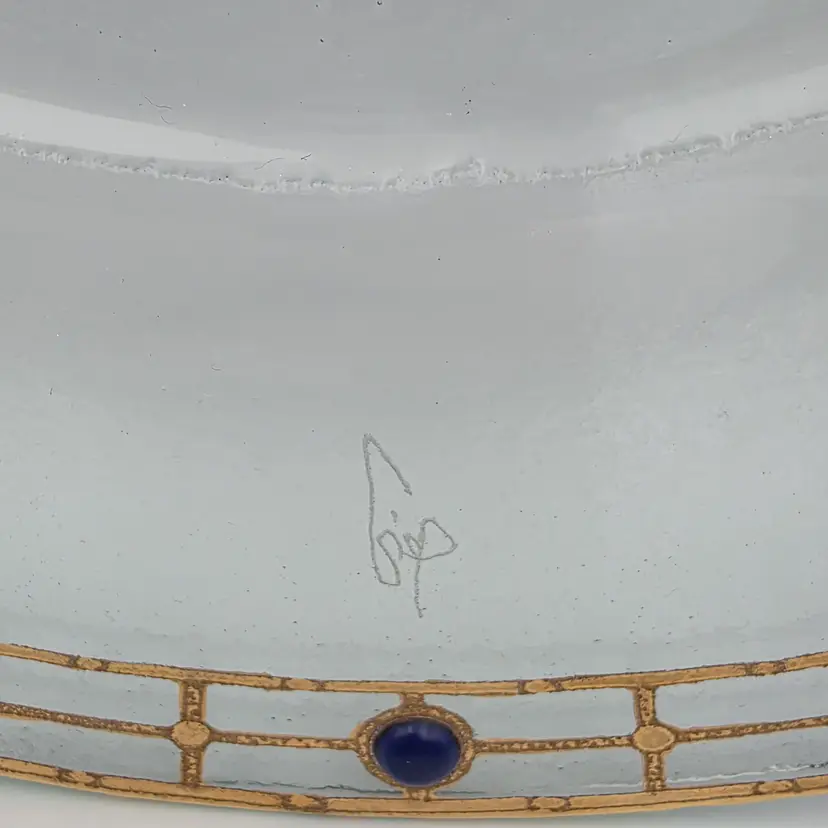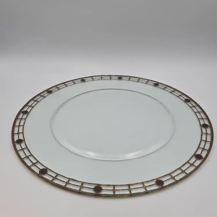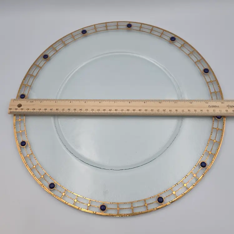 Large clear glass plate with beautiful gold gilt and opaque blue glass beads along rim. Great used condition, no chips or cracks, the gold gilt is in excellent condition and beads are intact. There are minimal surface scratches. Measures approximately 14 inches in diameter. Thank you for looking and have a great day!
