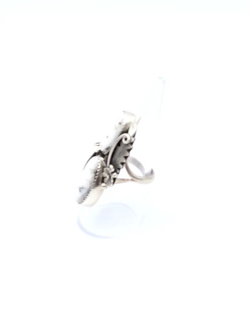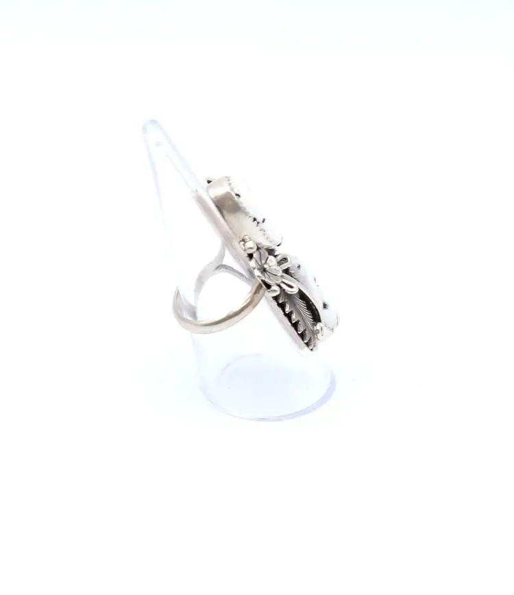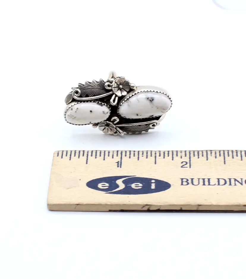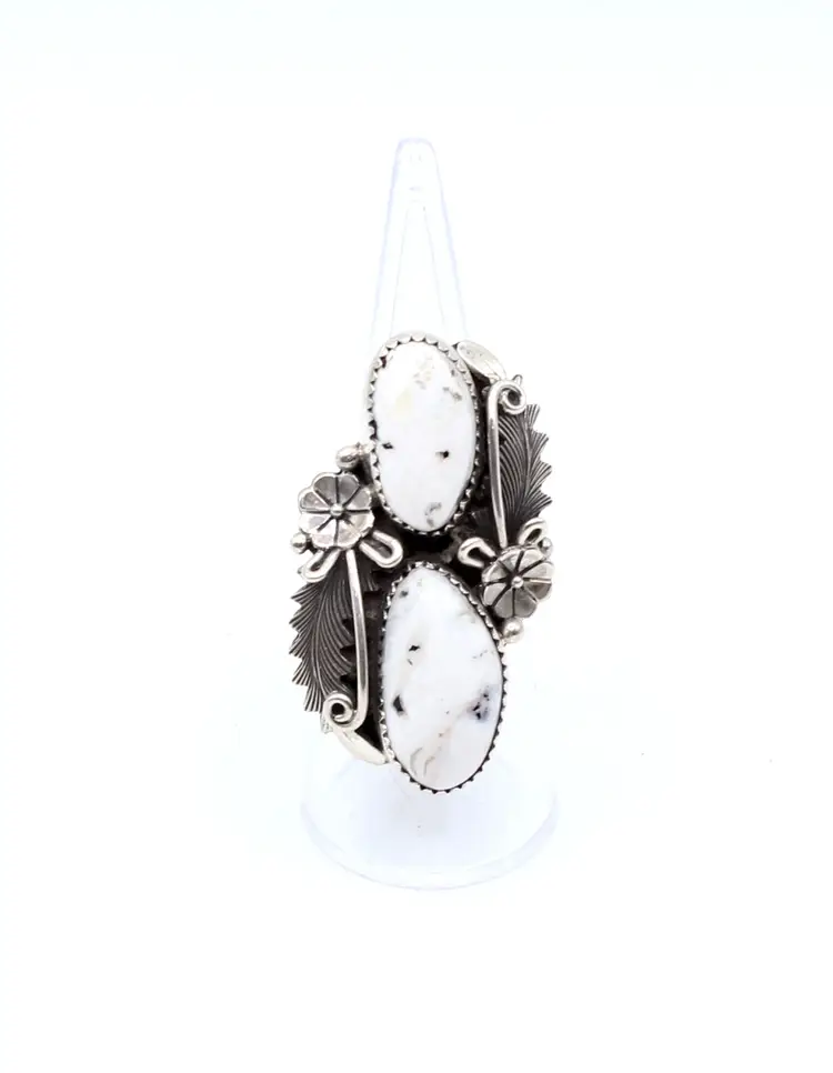 Fantastic signed Peter Johnson Navajo two stone ring. White buffalo turquoise is a misnomer for a unique white gemstone with black matrix, officially composed of calcite and dolomite, not turquoise. It is mined in Tonopah, Nevada, and is valued for its stark white and black patterns, which resemble the appearance and hardness of turquoise but lack the copper content that gives traditional turquoise its blue-green color. Two stones set in saw tooth bezel adorned with squash flower set on an unique 3mm band.