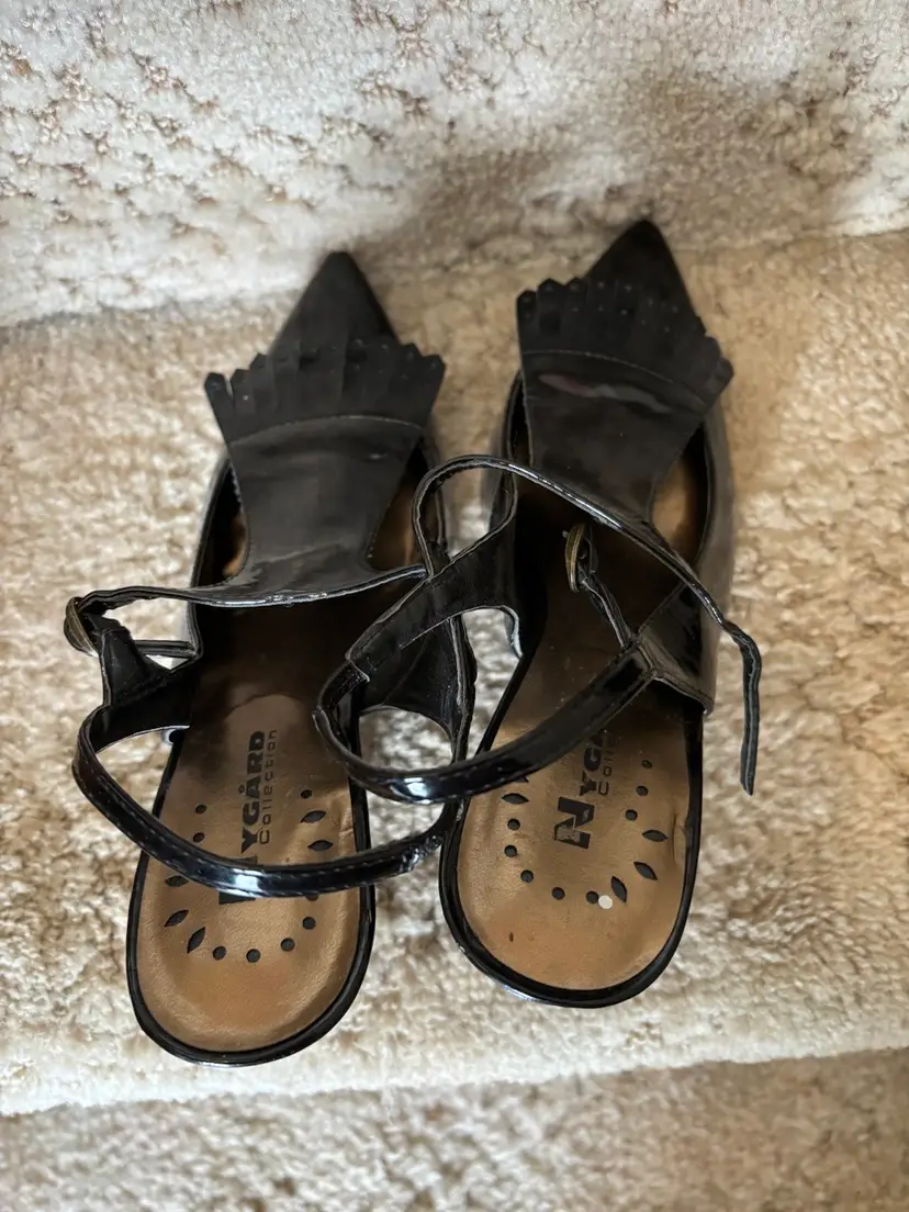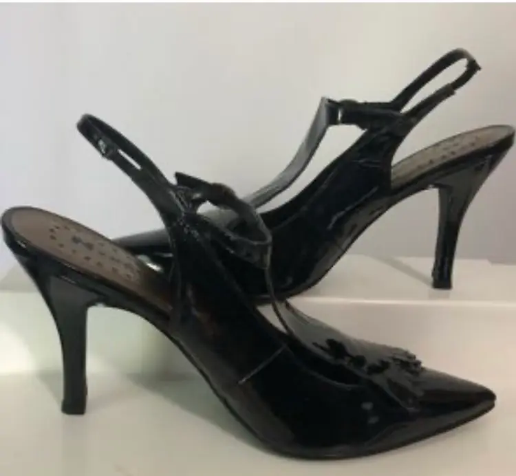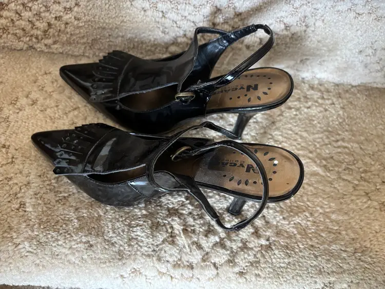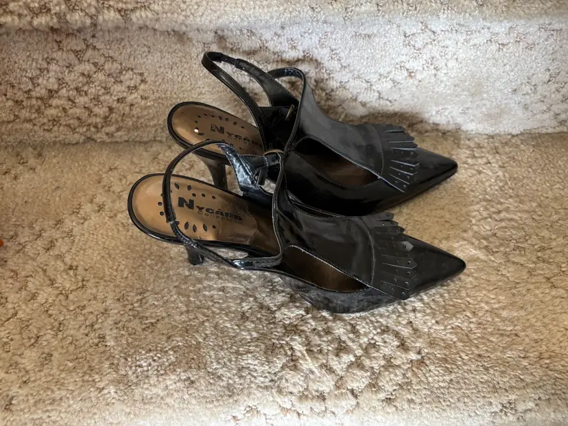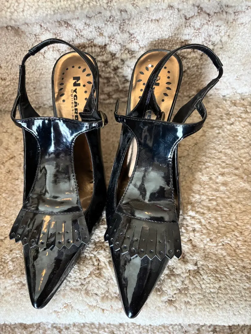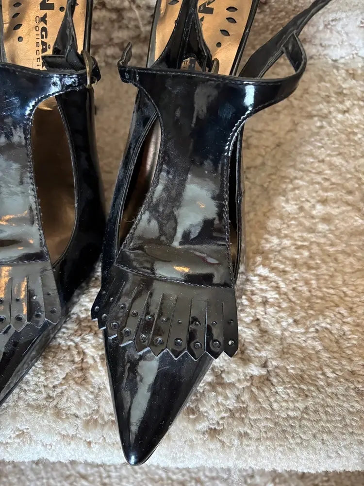 Pair of black patent leather slingback heels. Pointed toe. Features a T-strap and small fringe detail at the toe. High heel.