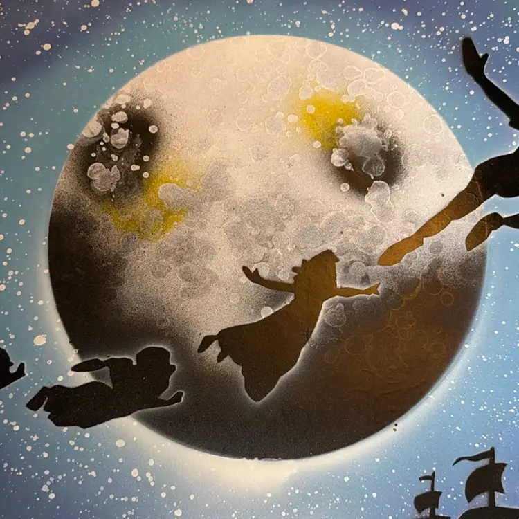 Peter Pan Spray Paint Art - depicting a classic scene from Peter Pan, showing silhouettes of the characters flying toward a large moon above Neverland, with a ship sailing on the water below.