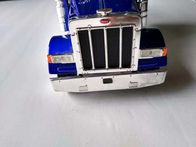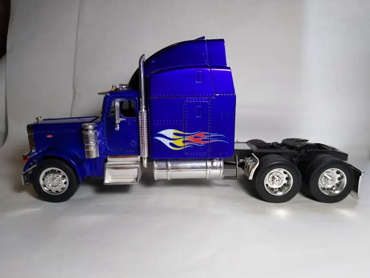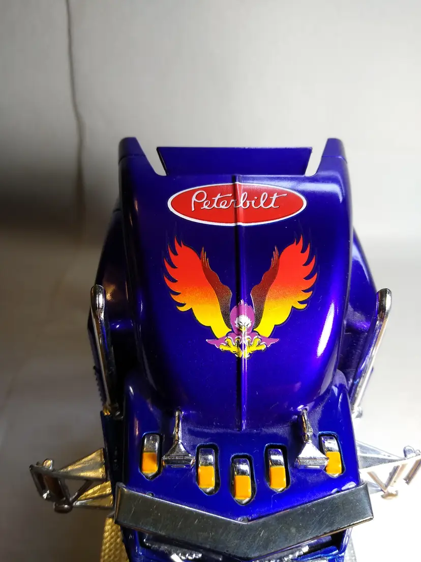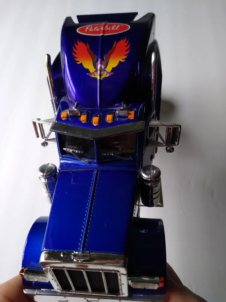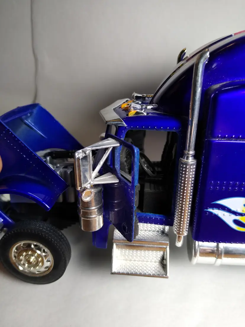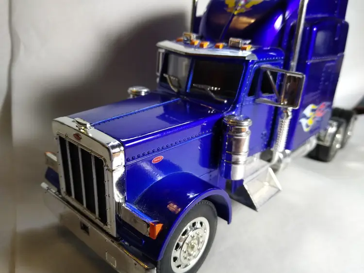 Experience the thrill of a classic Peterbilt Semi Tractor Trailer Truck Toy, model 20100, complete with moving doors and hood, adding a dynamic element to your play or display. Painted in a striking deep blue color, this 1:64 scale replica boasts intricate detailing that captures the essence of the iconic Peterbilt make, known for its robustness and durability in real-life transportation applications. Crafted from high-quality plastic, this toy truck is designed with functionality in mind, allowing for imaginative play or collection. It features a classic design that has stood the test of time, complemented by the eagle emblem, which adds a touch of pride to the craftsmanship. Whether for a collector or a budding truck enthusiast, this model is a fine representation of the legendary Peterbilt legacy.