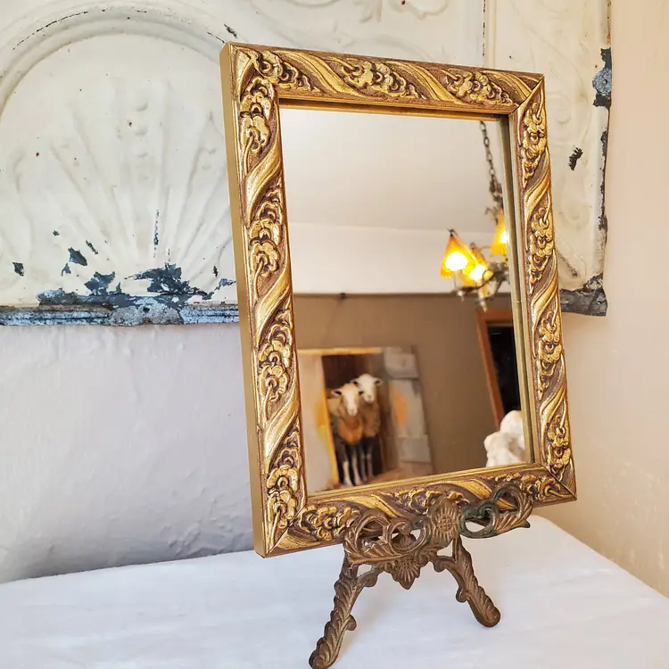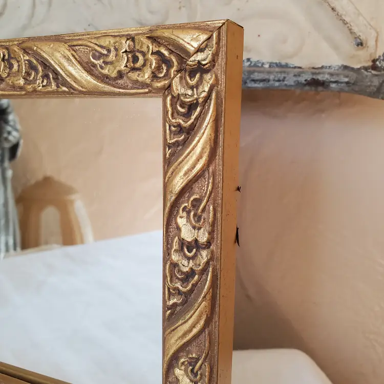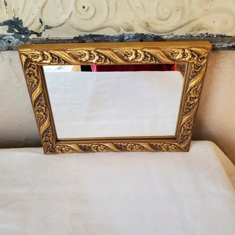 A petite gold frame mirror for gallery wall or layered on a bookshelf. In excellent condition. 8 1/4" x 6 1/4".