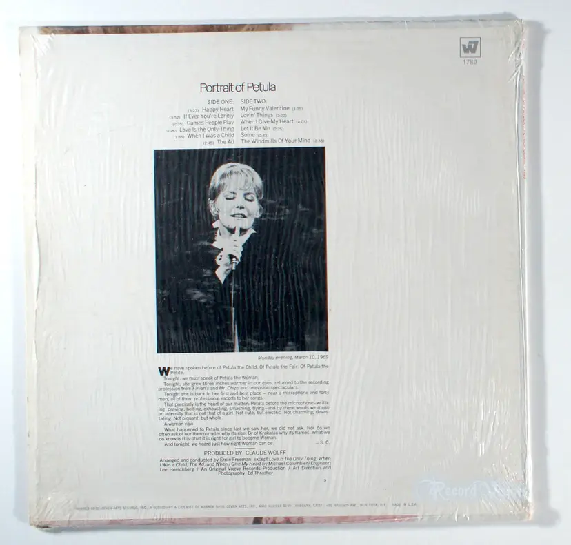 Portrait of Petula, by Petula Clark peaked at #37 on the U.S. Billboard's Albums Chart and featured the single Happy Heart. Happy Heart, a song written by James Last and Jackie Rae was recorded by both Petula Clark and Andy Williams and released as a single for each at the same time in 1969. It reached #12 on the Easy Listening chart and #62 in the UK for Clark. Clark was reportedly dismayed when Williams was a guest star on her second TV special, with the plan to perform the song they were both launching as a single. Happy Heart was notably used on the soundtrack accompanying the British film Shallow Grave (1994), starring Ewan MacGregor and Christopher Eccleston, and directed by Danny Boyle. According to a reviewer on allmusic, "Clark is a pop star, pop is what she does best, and the orchestration works here when she sings Let It Be Me, the many instruments augmenting, not battling, the singer's unique and familiar pipes. Some is just beautiful, worth the price of admission on its own. There are more highs than lows on Portrait of Petula, and My Funny Valentine is charming and sweet. Windmills of Your Mind is an intriguing version, sophisticated somewhat like Noel Harrison's, but bringing the fan of Clark back to the fact that, as with Springfield, her gems like It's a Sign of the Times are where she wins over listeners completely. For those who want a change of pace from Clark's greatest hits, this is it."
