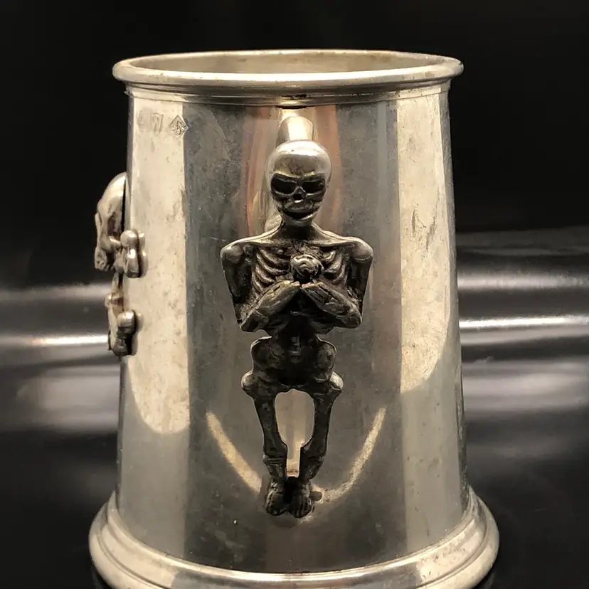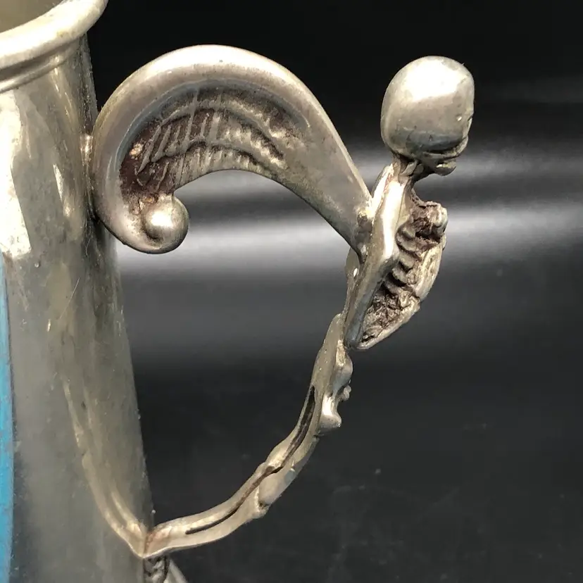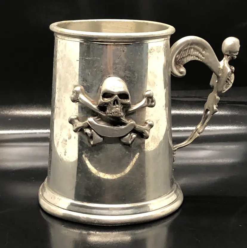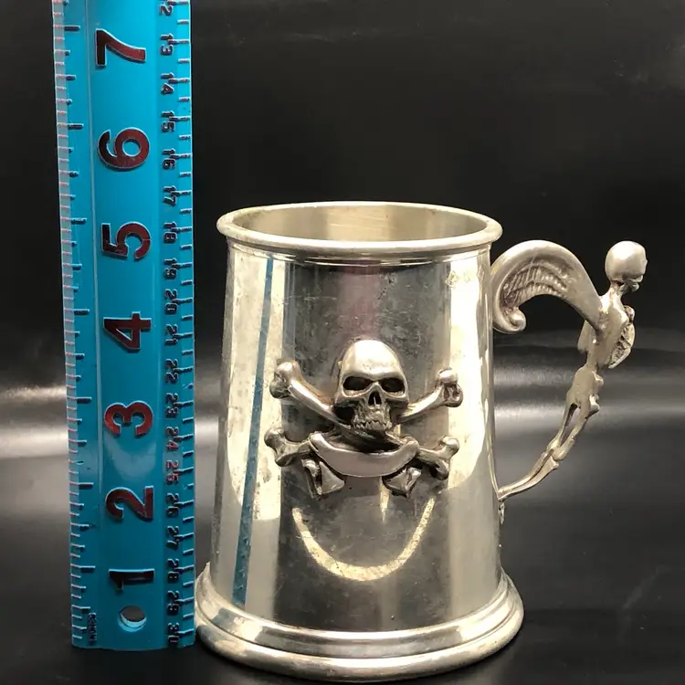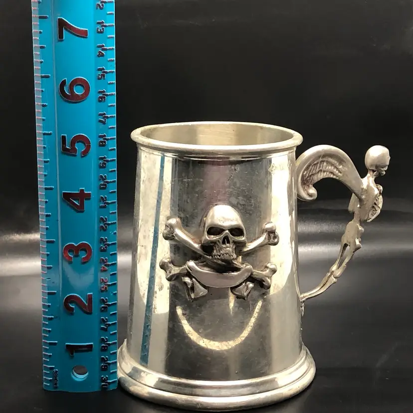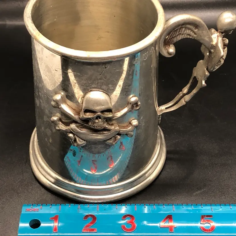 This antique Pewter mug from Sheffield England is a unique addition to any collection. The skull design on the front makes it a perfect item for Halloween or any collector who appreciates unique pieces. The mug also features markings and a tanker design adding to its overall charm. This Stein has not been cleaned and is in it’s original state when found. It has some marks and dings from years of wear. I