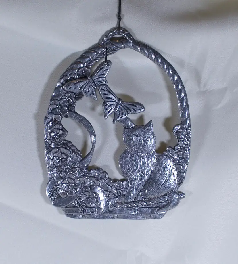 Pewter Playful Cat and Butterfly Wind Chime 8.75" Tall. In good condition. 6.25" wide x 8.75" tall