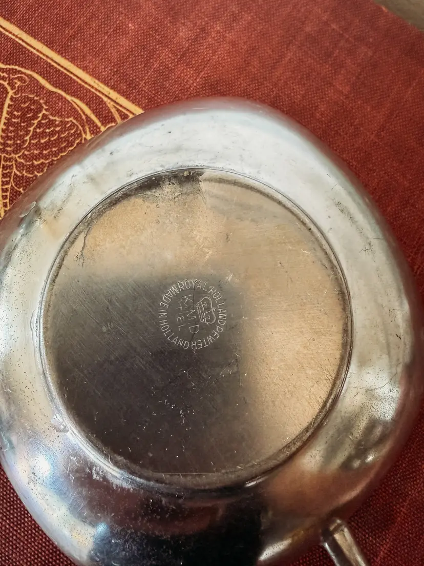 This is a vintage Royal Holland Pewter Daalderop square cup, bowl, or sauce boat. approximately 4 inches square and is 1 3/4 to 2 inches tall. It features a finger-grip handle with a thumb rest for ease of holding.