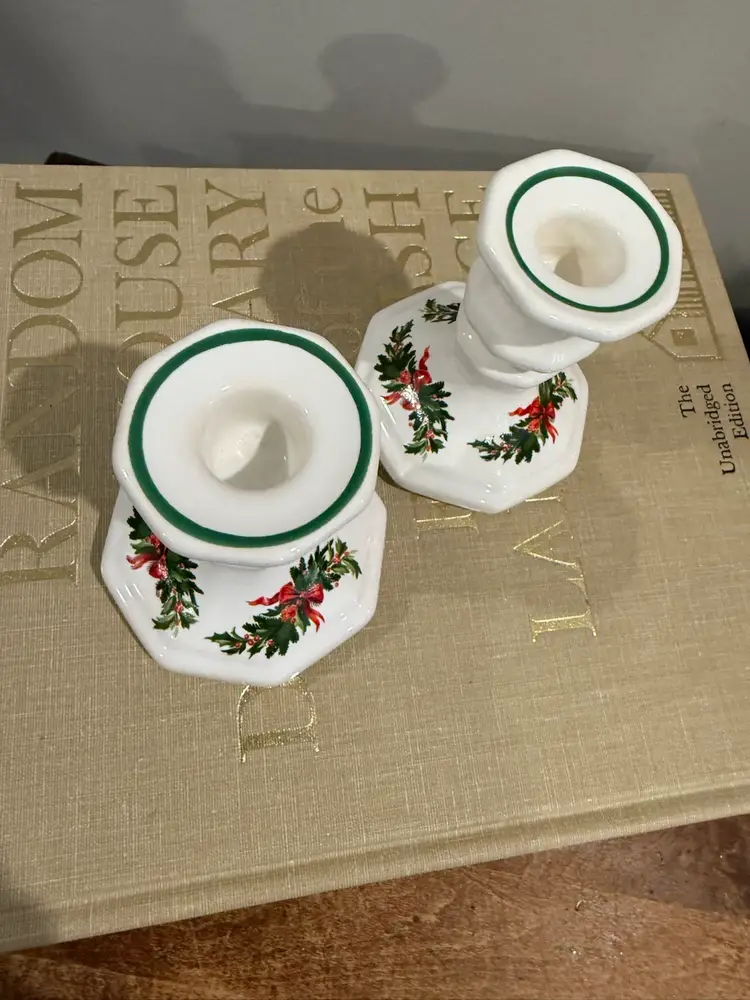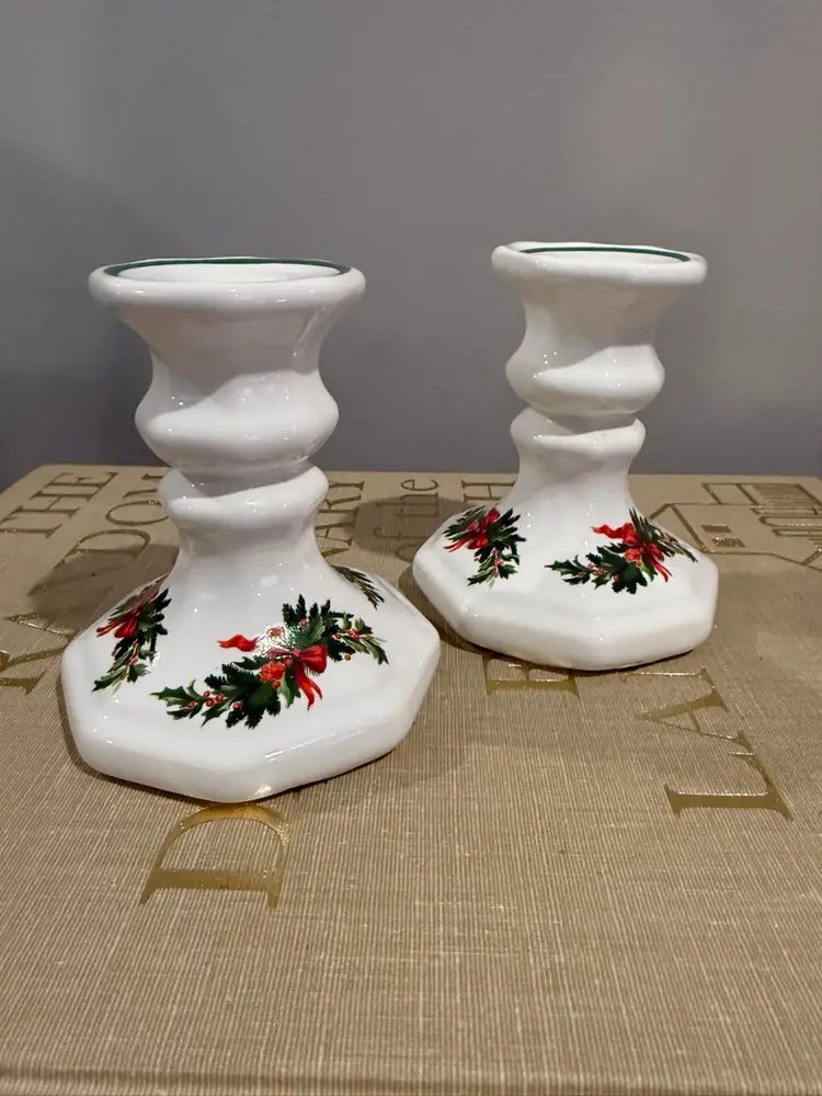 Add a festive touch to your holiday decor with this charming pair of Pfaltzgraff Christmas Heritage candlestick holders. Crafted from durable ceramic, these holders feature the classic Christmas Heritage pattern with holly, berries, and ribbons, perfect for creating a warm and inviting atmosphere. They are in excellent pre-owned condition, with no chips, cracks, or significant wear. Ideal for Christmas dinners, mantelpiece displays, or as a thoughtful holiday gift.