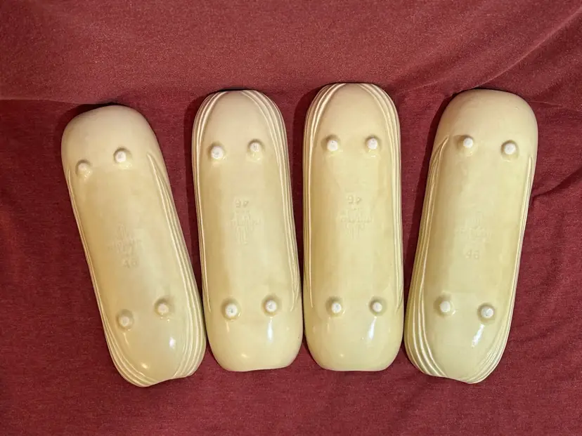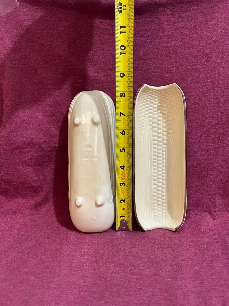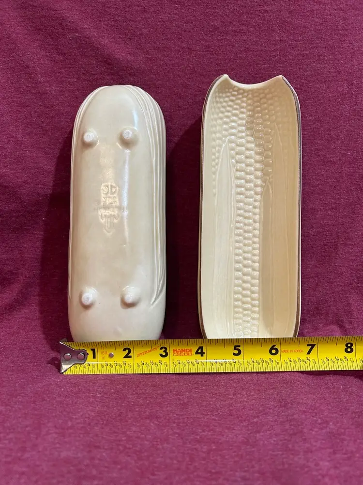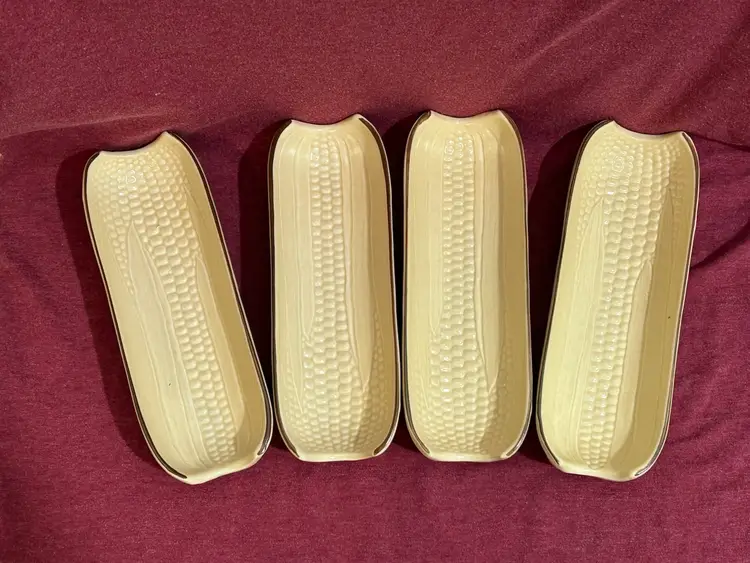Four vintage Pfaltzgraff USA stoneware corn-on-the-cob dishes, molded corn relief design in a warm cream glaze with a subtle brown rim (excellent). USA mid-20th-century Pfaltzgraff stoneware. Hand-applied glaze. The raised corn pattern helps cradle corn on the cob. Excellent vintage condition. No chips, cracks, or repairs. Measurements in the photos. A great addition to a Pfaltzgraff collection or a charming accent for farmhouse, harvest, or holiday table settings.