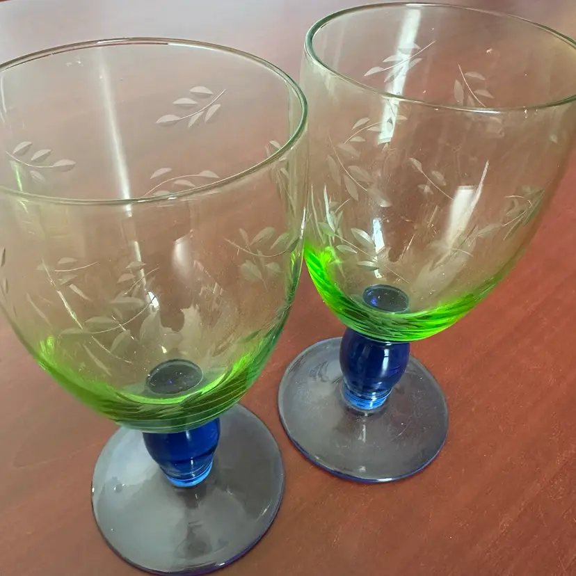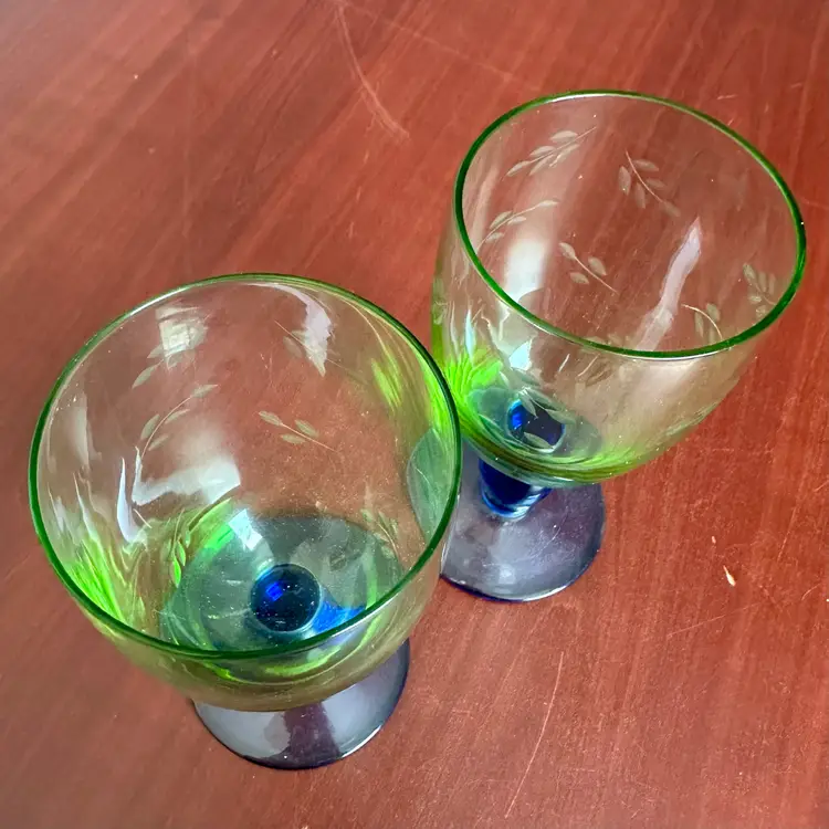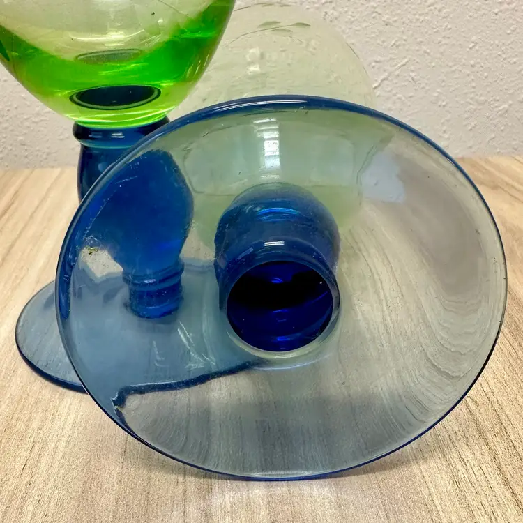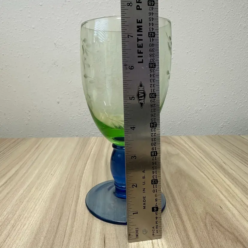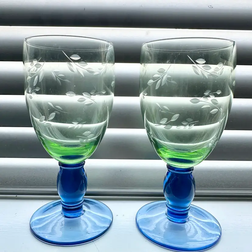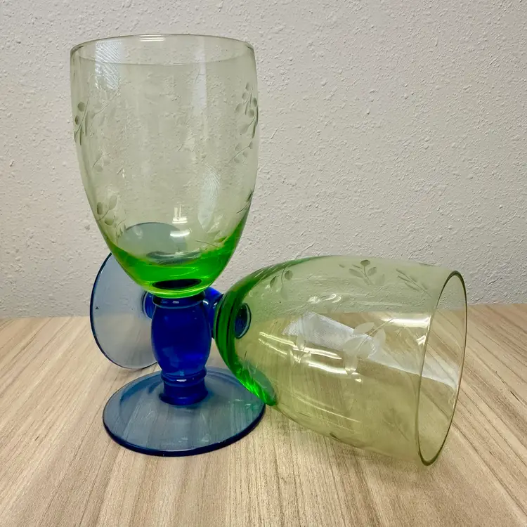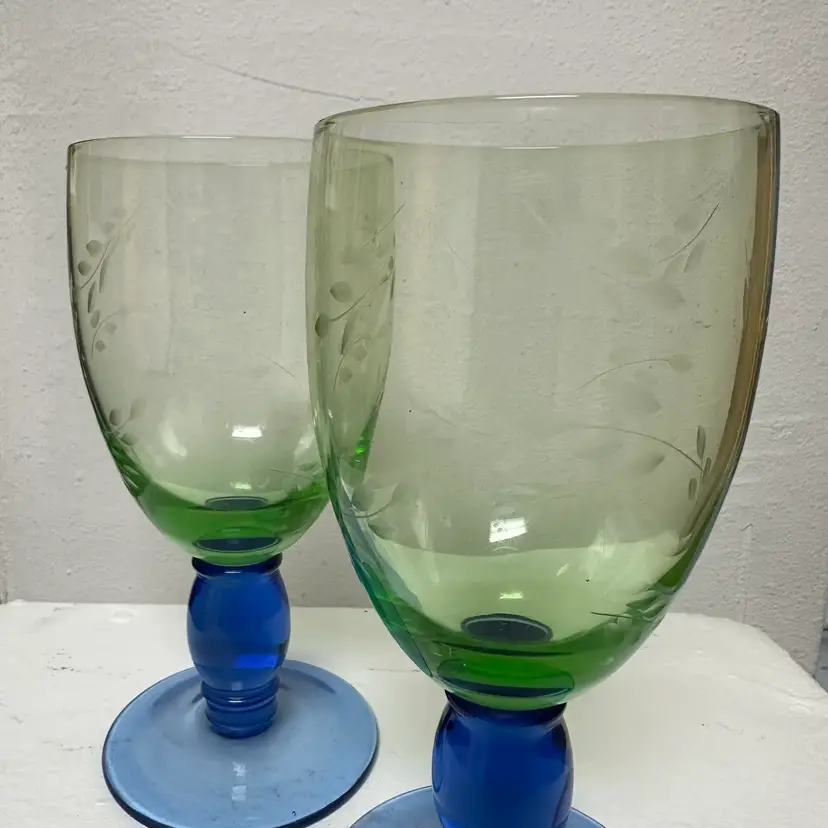 This listing is for two Pfaltzgraff Summer Breeze Iced Tea Glasses. They feature a beautiful green bowl with a blue stem, standing at 7 1/2" tall. These decorative and floral-themed glasses are hand-blown and etched with the Summer Breeze pattern, making them a vintage piece from the 1990s. The vibrant colors of blue and green add a touch of elegance to any table setting, making them perfect for serving iced tea in style. They are in excellent vintage condition, no nicks or cracks, there is however, a small barely visible scratch on one of the glasses (see photo).