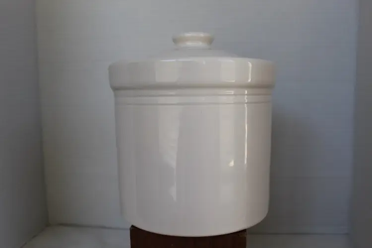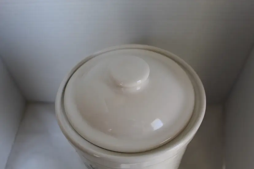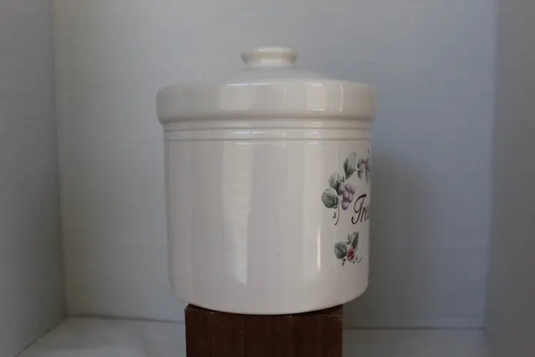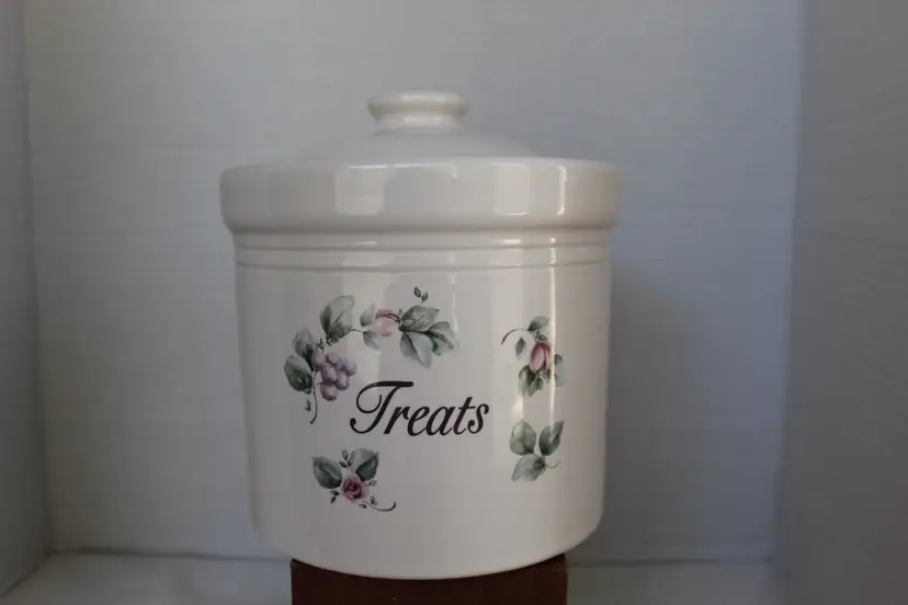 The Pfaltzgraff Tea Rose "Treats" Canister is a charming round stoneware container featuring a beige, pink, blue, and green floral design in the Tea Rose pattern. With a diameter of 6 3/8 inches and a height of 8 inches, this canister is perfect for storing treats, cookies or other kitchen essentials. Made in the United States, this country and farmhouse style canister is easy to clean and dishwasher safe, making it both functional and decorative for any kitchen.