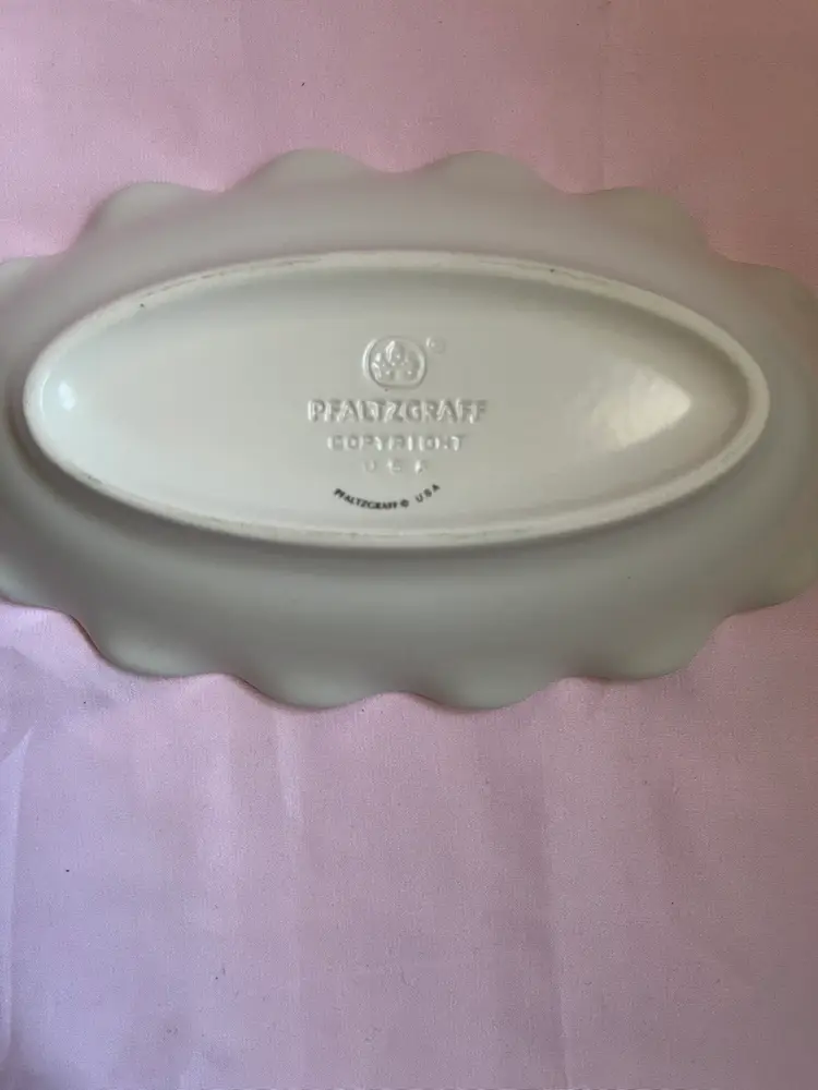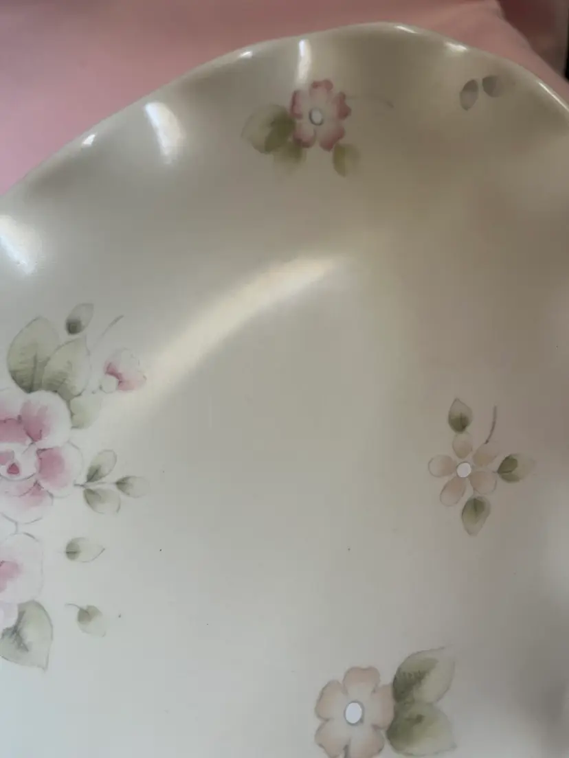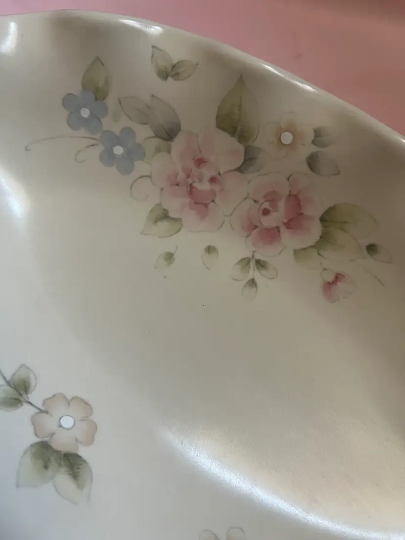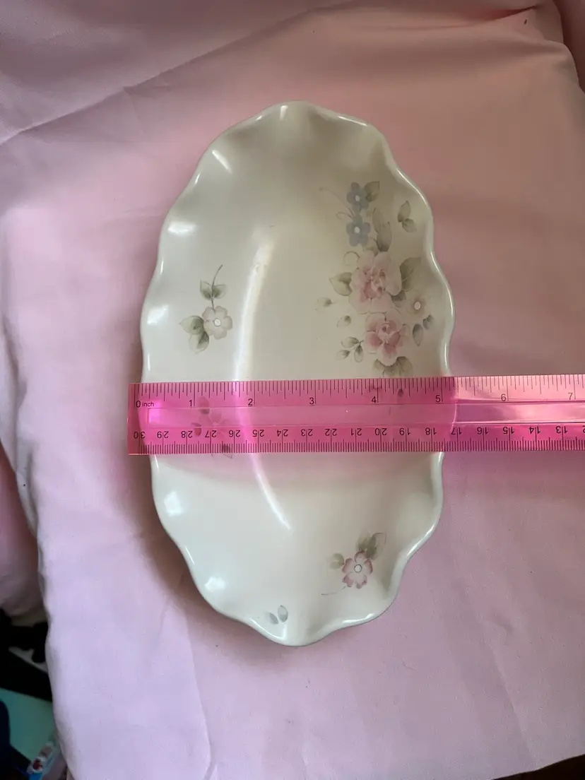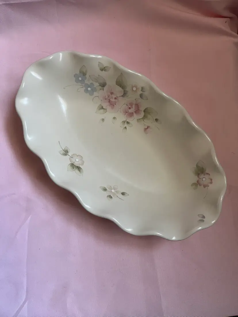 Vintage Pfaltzgraff tea rose ruffled dish 9inches long by 5 inches wide Marked USA No chips, flea bites, or crazing. There is some scratches like utensil marks that are very faint