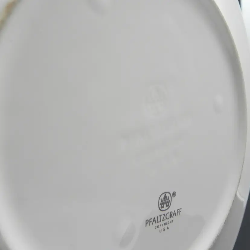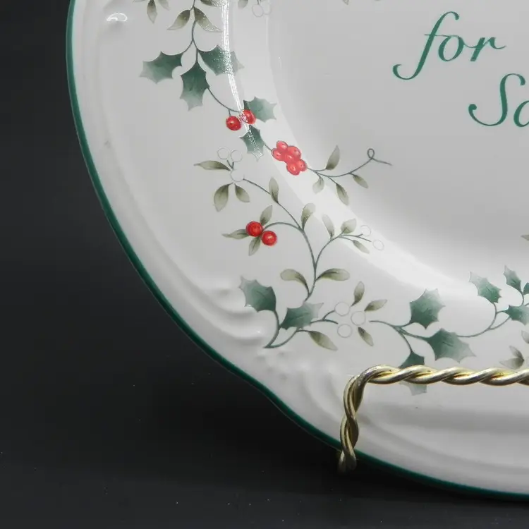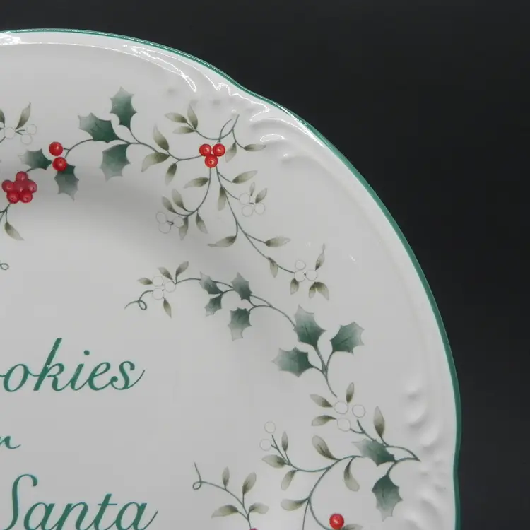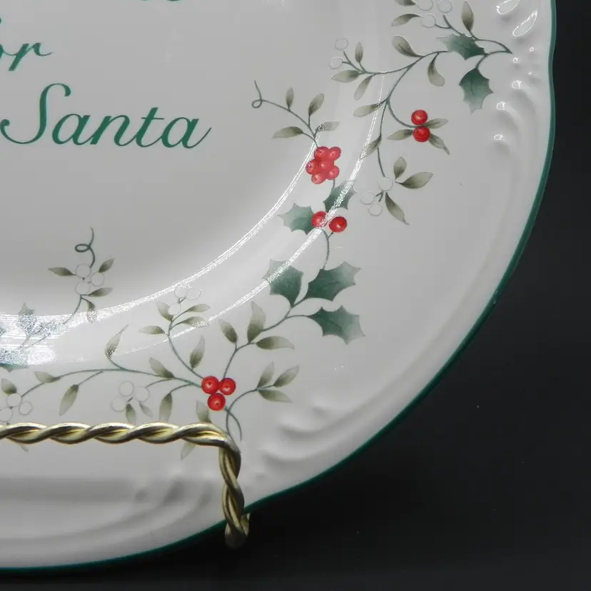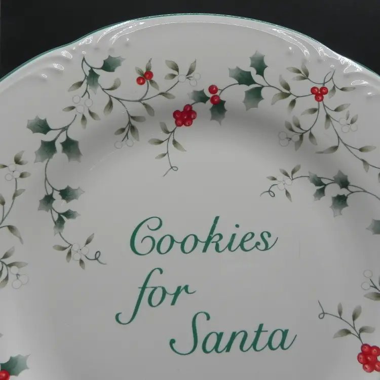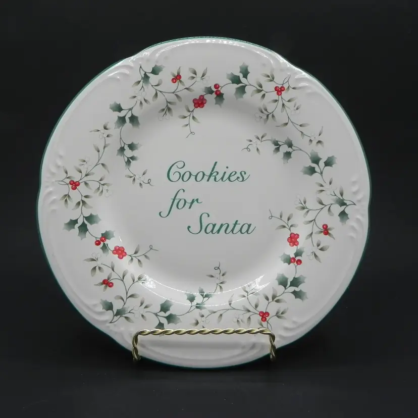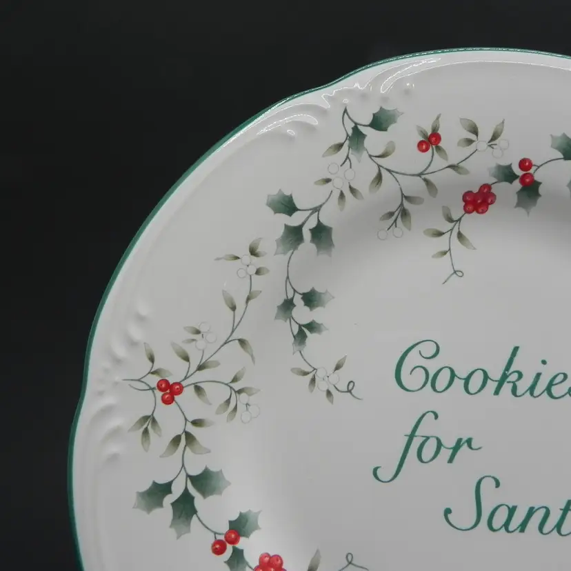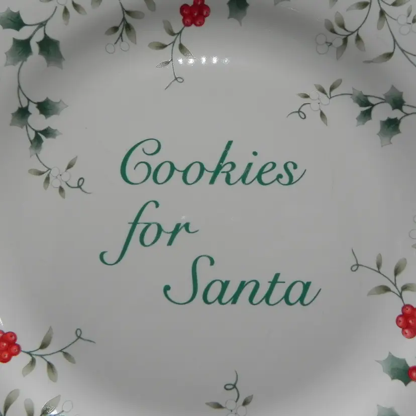 The Pfaltzgraff Winterberry Cookies for Santa Plate is a 1994 Christmas platter made in Pennsylvania. This round 9" ceramic plate features a Winterberry pattern on a white background. It is dishwasher safe and part of the Winterberry product line, suitable for use by teens, boys, girls, adults, and unisex kids during the holiday season.