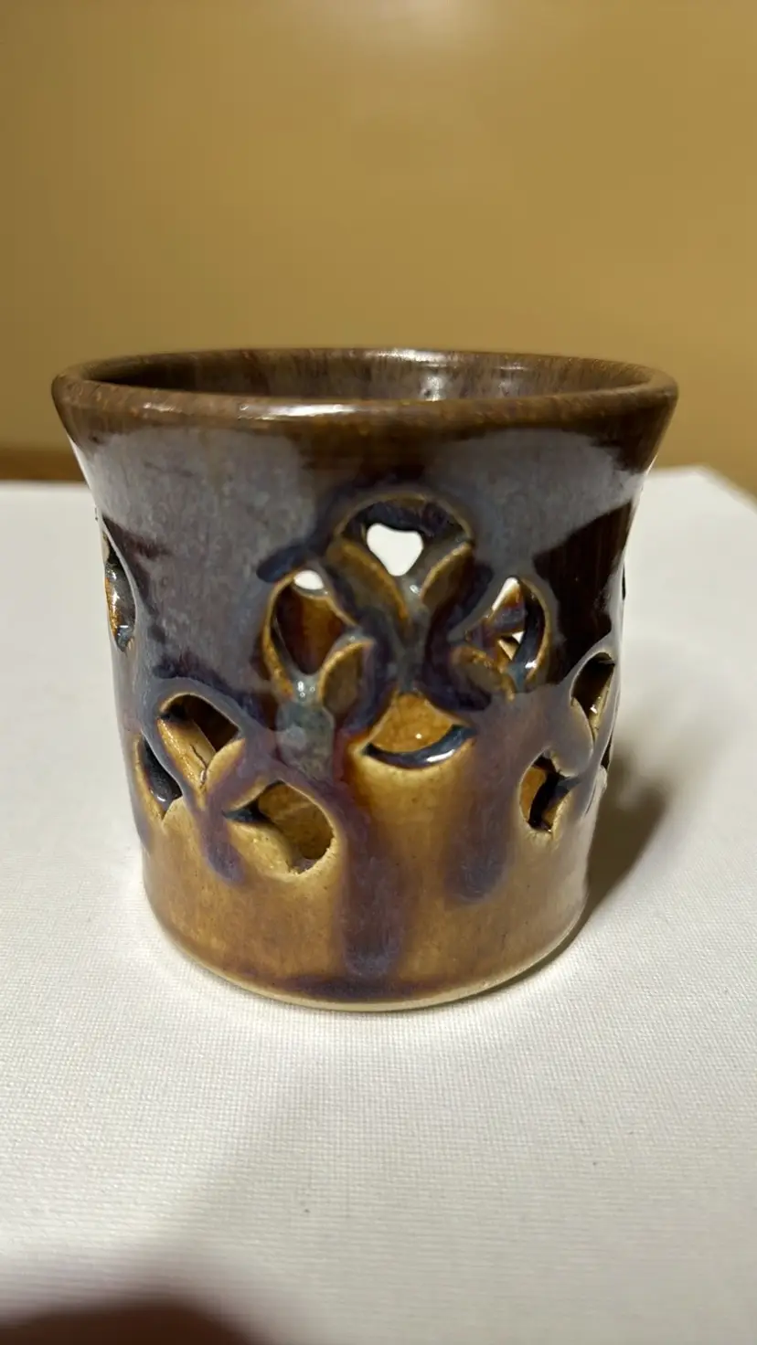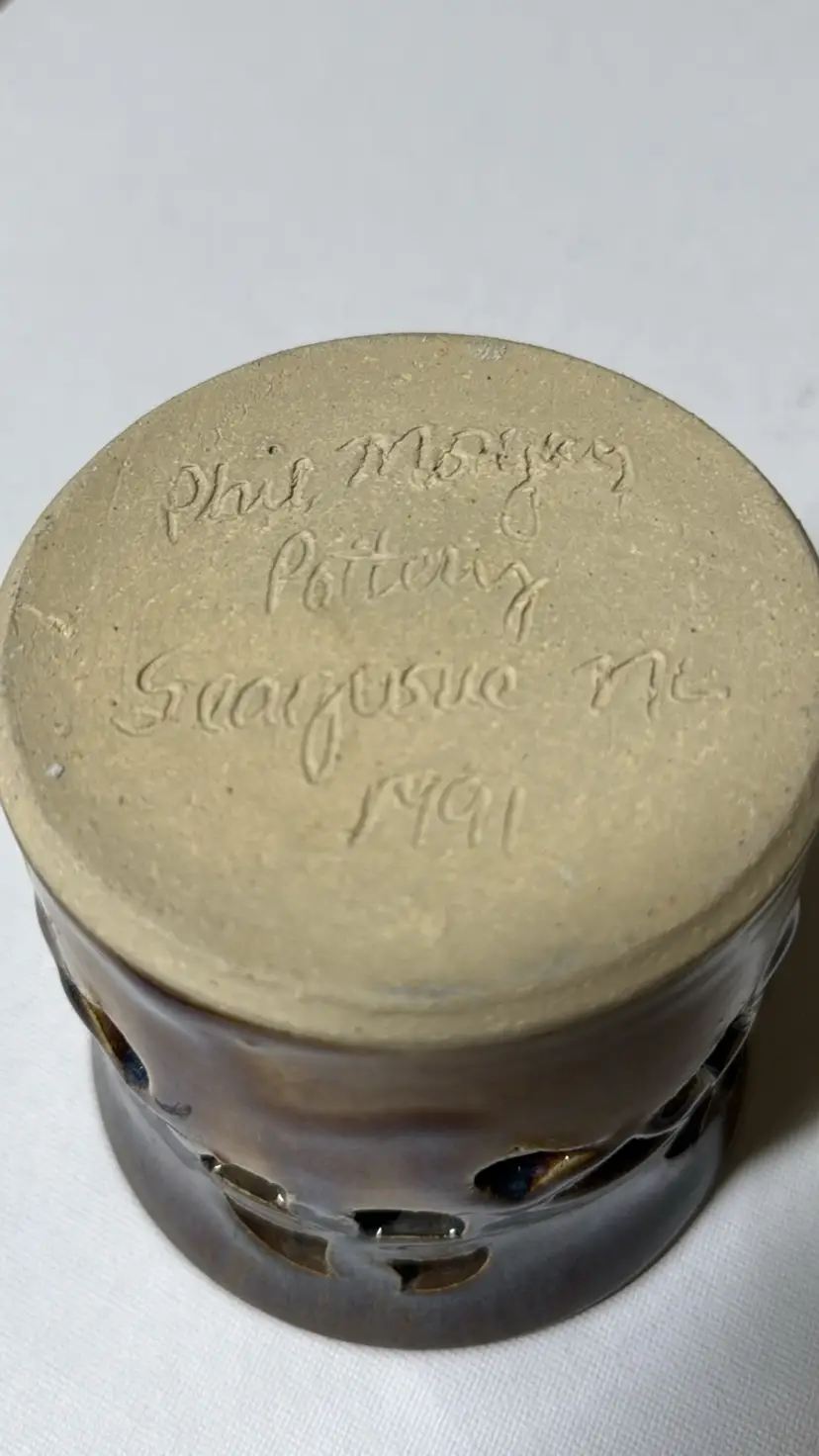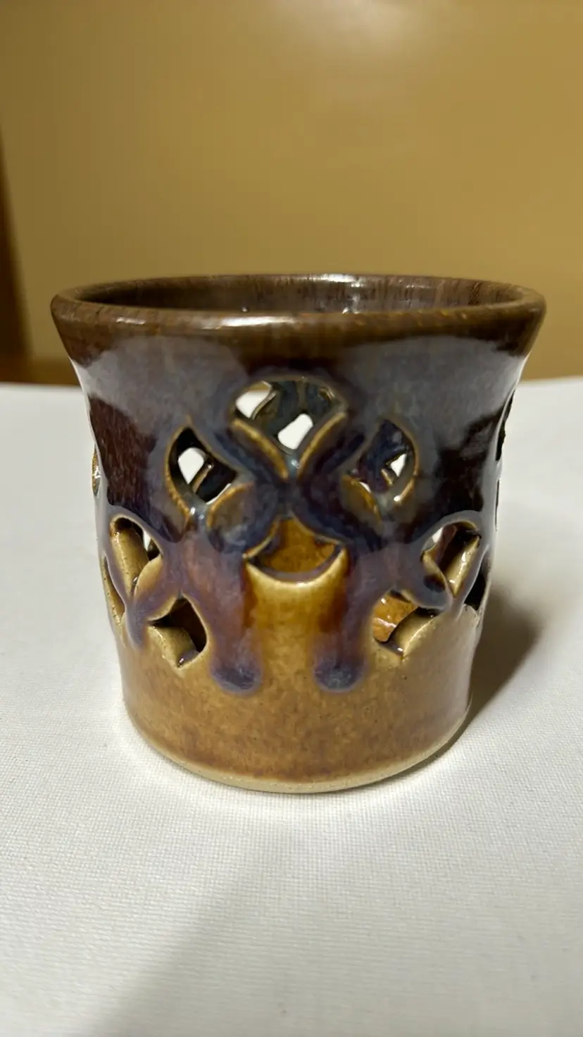 Studio pottery luminary Fairy light with cut out design Clay candleholder tan blue and purple drip glaze Signed Phil Morgan Pottery Seagrove, NC 1991 3.75” tall 4” diameter Nice one of a kind piece with no breaks or chips (22729242)