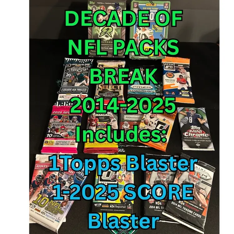 Team Auction 2014-2025 NFL Packs Break. TEAM Auction Break (you are bidding on team shown). Break will include 1- 2025 Score Football Blaster Box, 1-Blaster Box of 2024 Topps Resurgence, 1- 2024 Absolute Fat Pack, 1-2023 Select fat pack, 1-2022 Prizm Retail Pack, 1-2021 Optic Value Pack, 1-2020 R&S Retail Pack, 1-2019 Prizm Blaster Pack, 1-2018 Donruss retail pack, 1-2018 R&S Blaster Pack, 2-2017 R&S Retail Pack, 1-2016 Optic Pack, 2015-Mini Chrome Hobby pack, and 2-2014 Prizm Retail Pack. For a Total of 30 Packs. Rip will happen on Dibdit Cards District Community during the live show starting at 09:40 Est on 08/09/2025. US Shipping is $5 for your first spot, $.25 each additional spot you win. Shipping will be within 1 week after the break to account for progressive shipping. Please notify me if you would like us to ship immediately. Any spot won where no cards of the team are found in the boxes that are opened, will receive a player card or cards of the same sport. Any multi-team base cards will be divided as evenly as possible between subjects on the card; any multi-team HITS (serial #'ed or dual/triple autos or relics) will be assigned by draw to one participant from the participants who own the depicted teams/players.