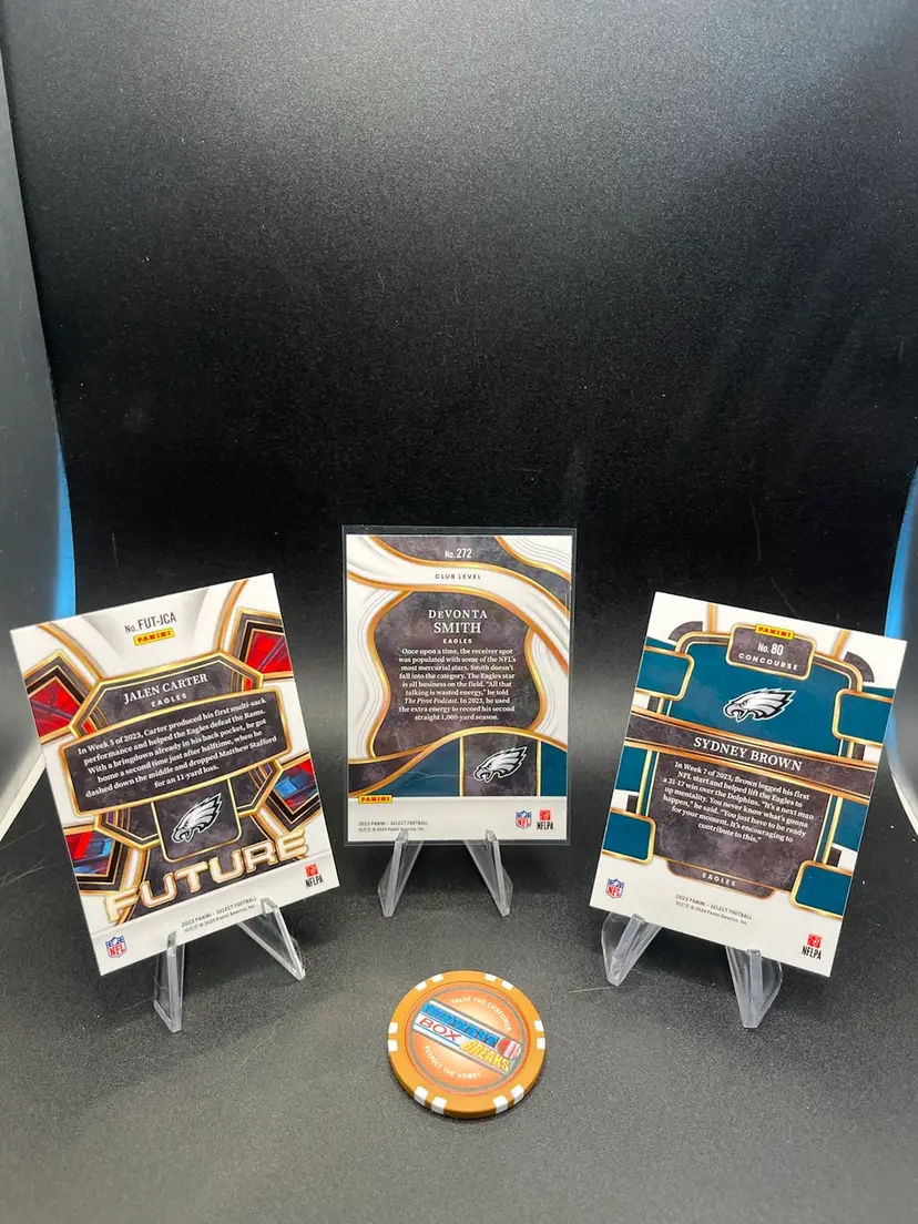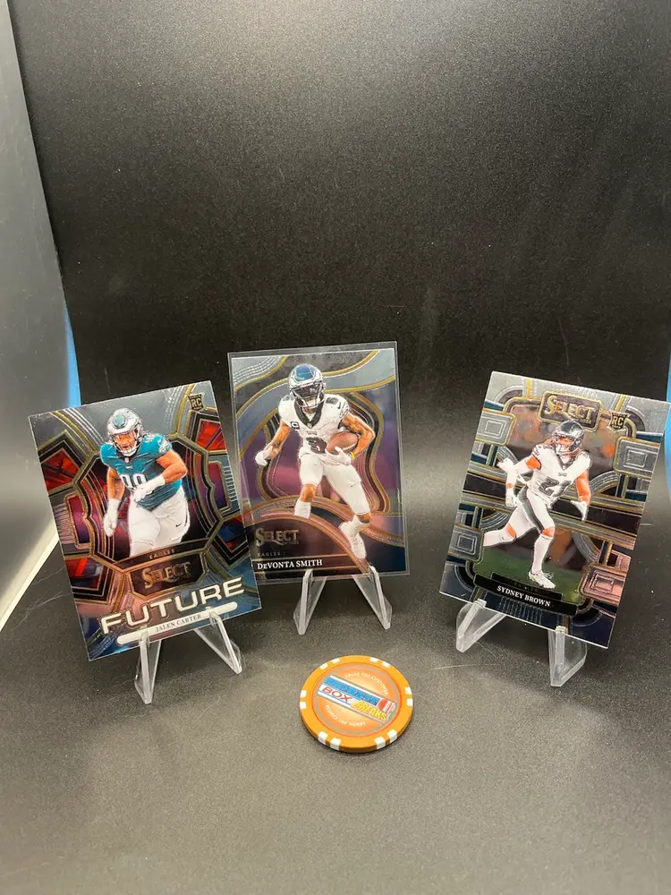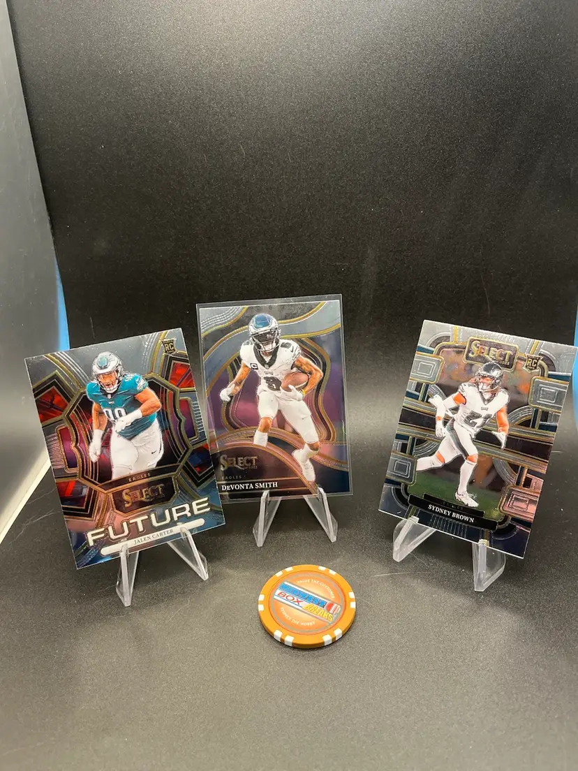 3-card lot from 2023 Select. Jalen Carter Future RC, Devonta Smith field level, Sydney Brown RC.