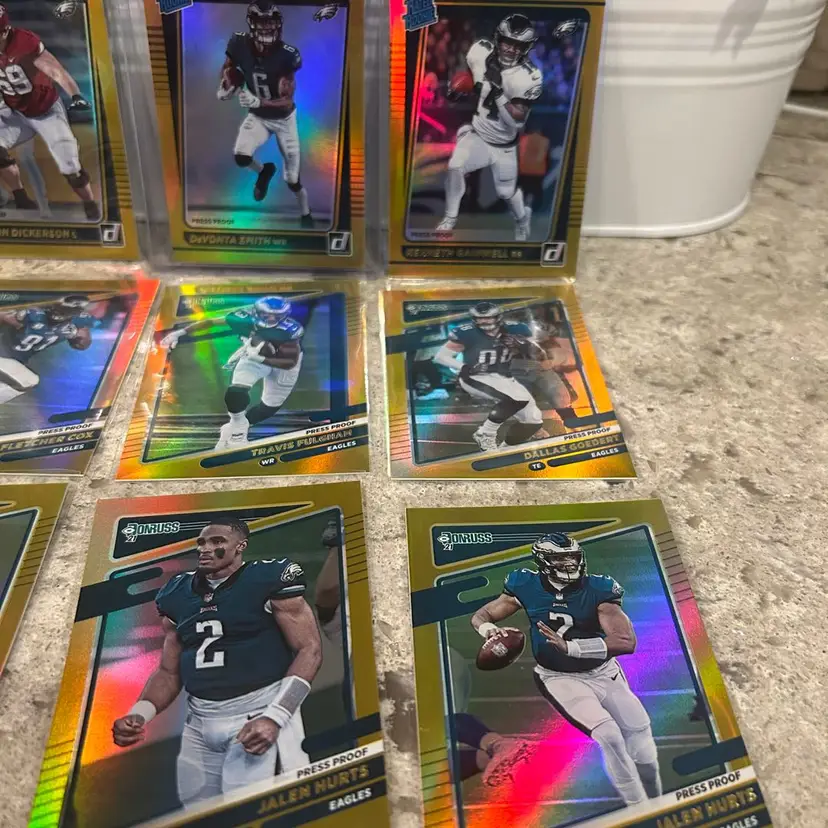 Donruss complete Philadelphia Eagles Team Set Press Proof Gold Premium Stock 2021 (first year premium press proof stock gold) including DaVonta Smith Rated Rookie and 2 second year Jalen Hurts cards and will ship BMWT ($5). Progressive shipping of $.25 per item.