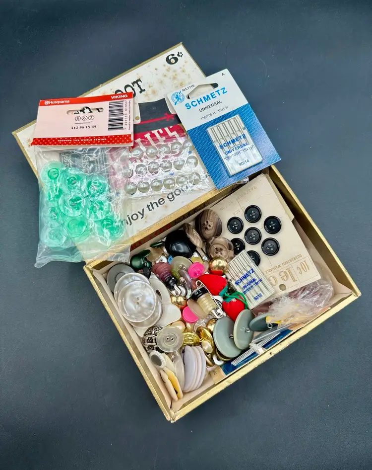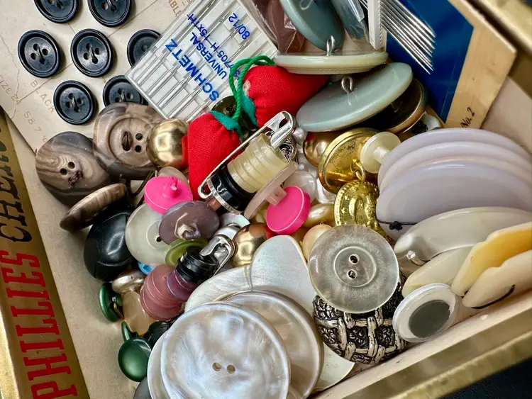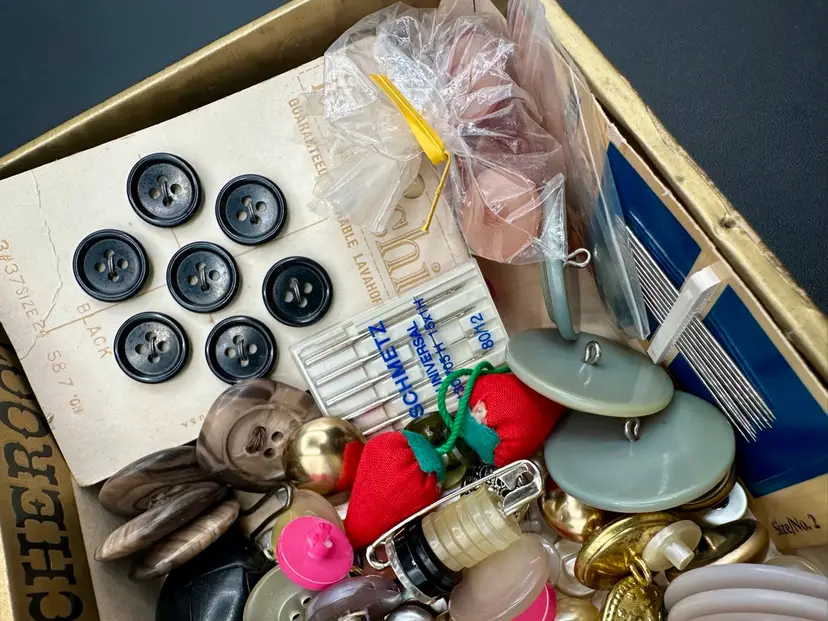 A sweet small sized cigar box with a BUNCH of vintage buttons & needles. You get it all!!