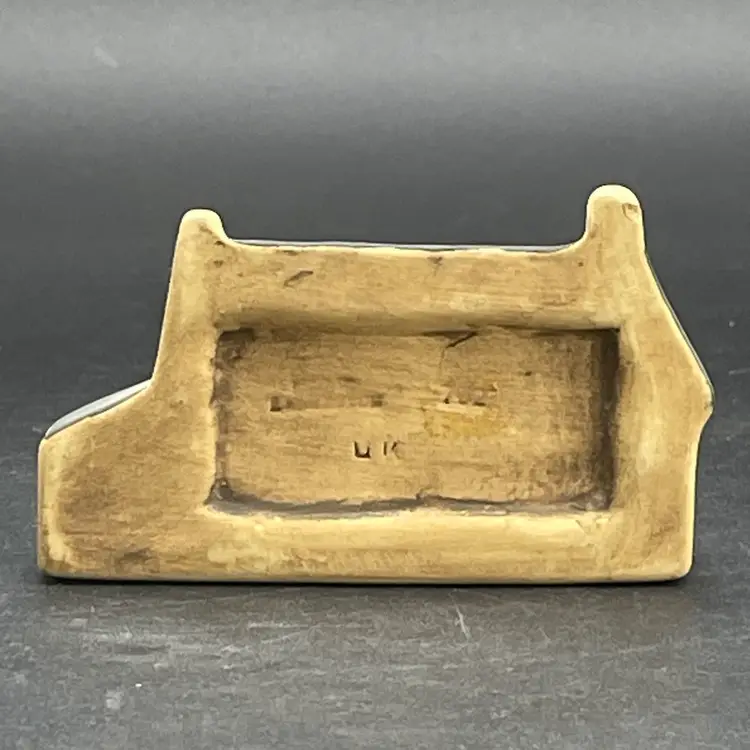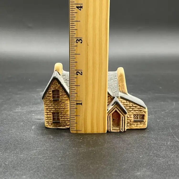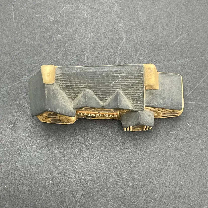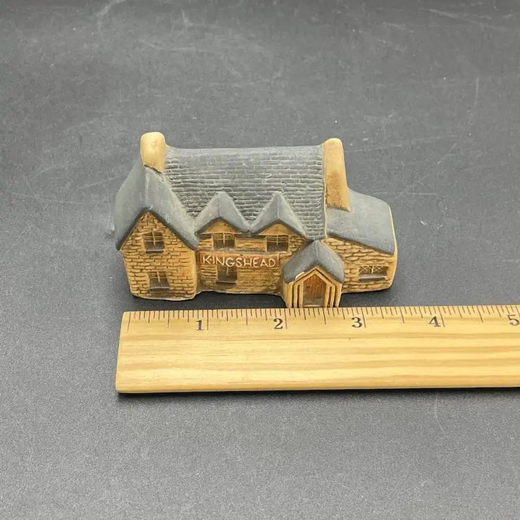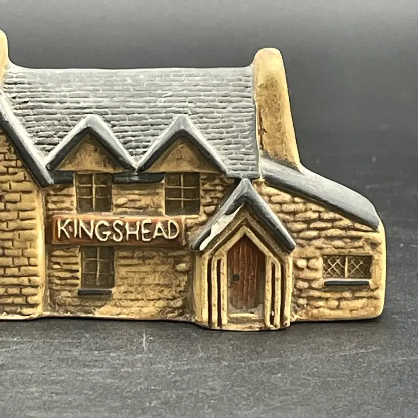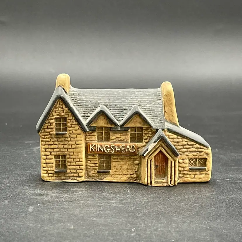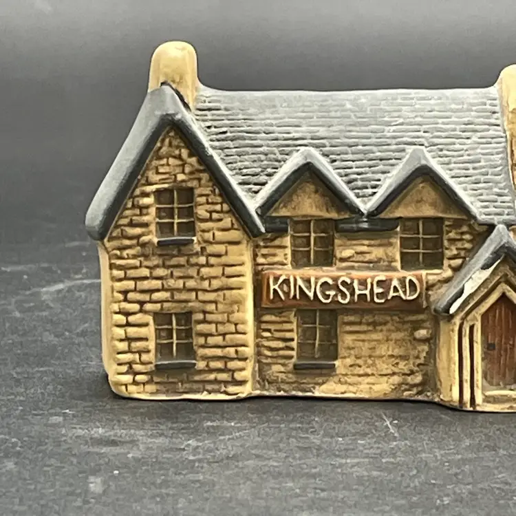 This is a vintage Phillip Laureston #702 Kingshead Pub miniature pottery English village building. Marked on the back. Made in England. Measures approximately 2.5" tall x 3.5" long. There is a chip on the eve over the door as shown in pictures. No other major flaws.