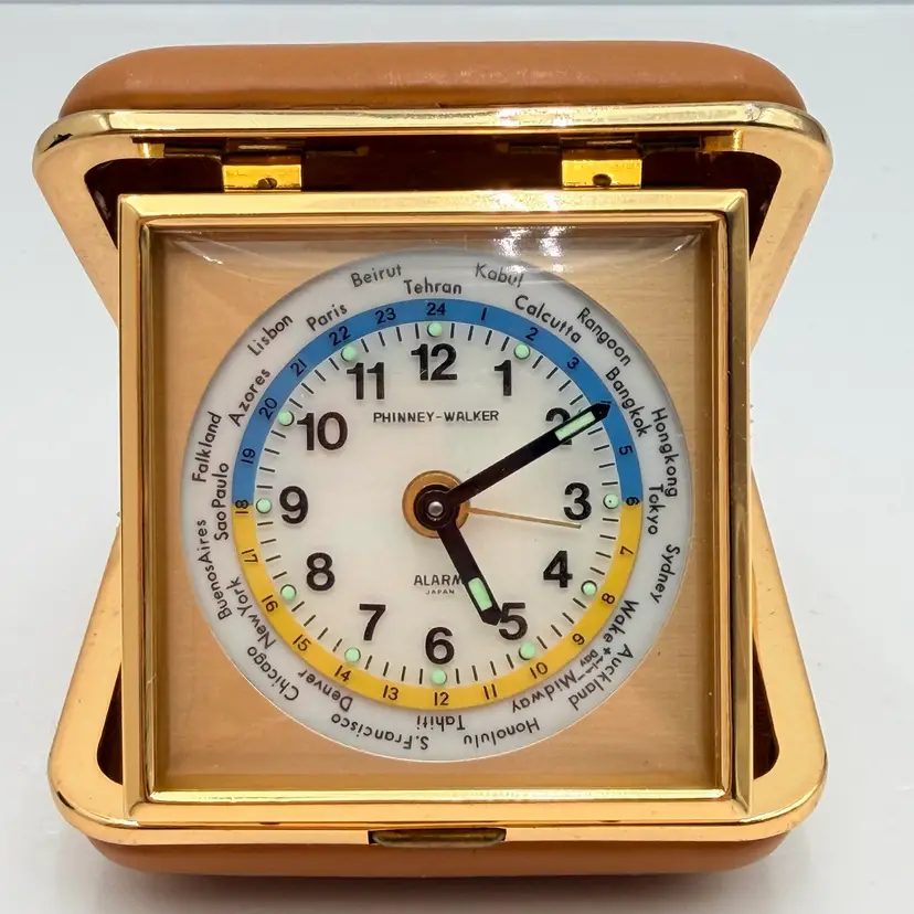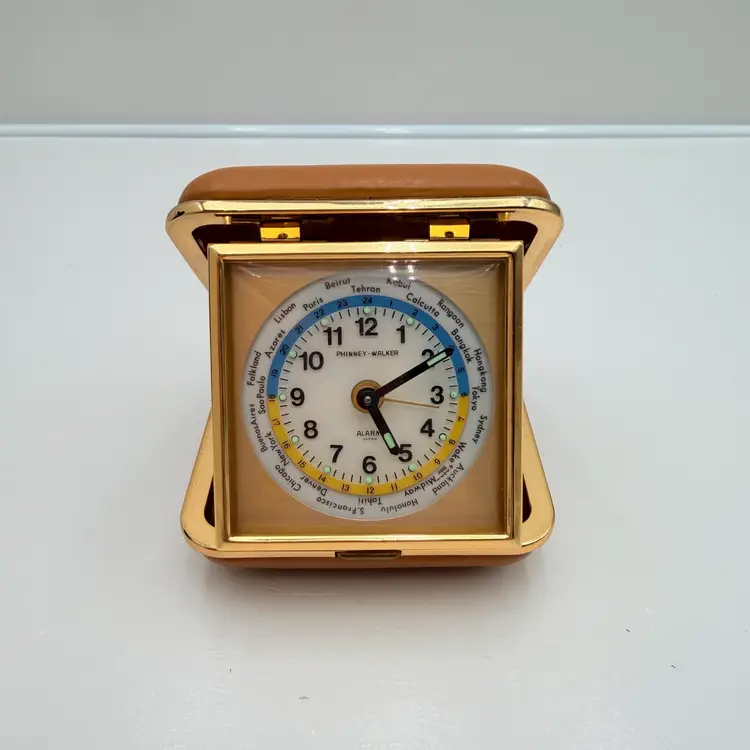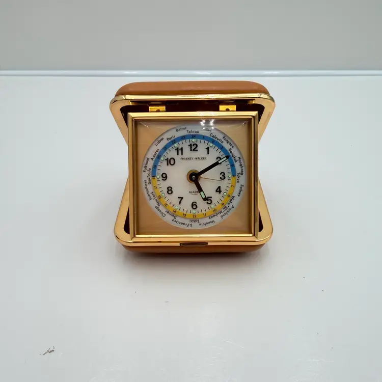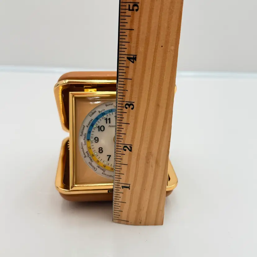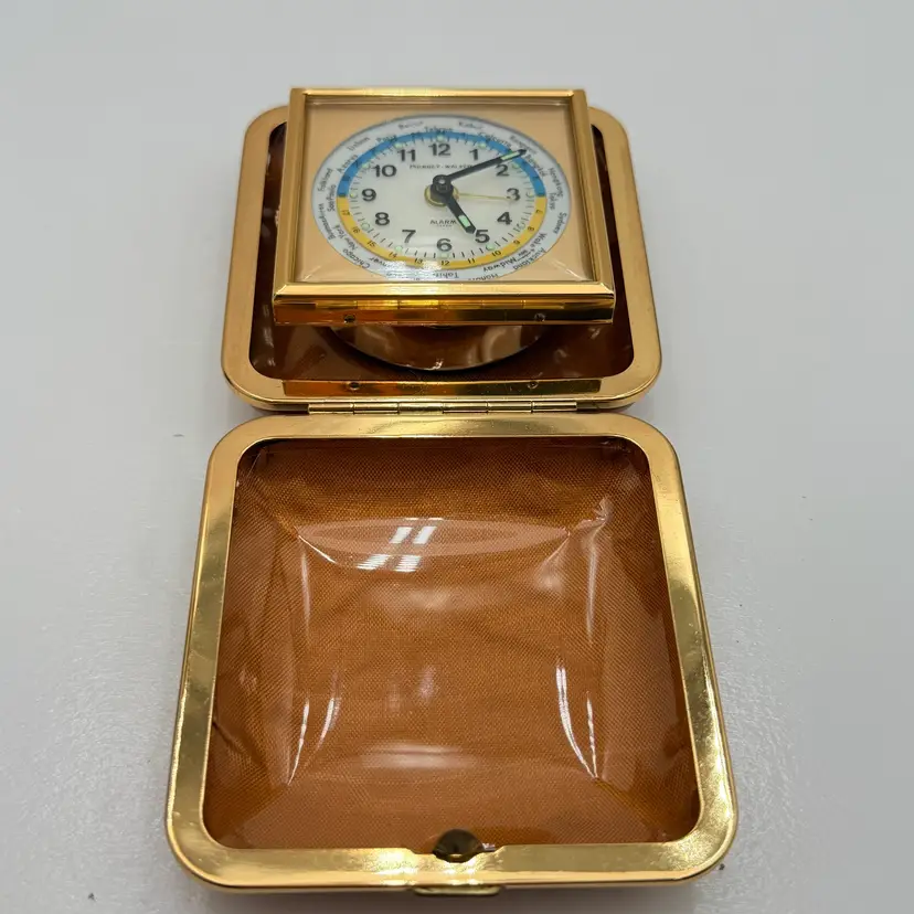 As shown 1.5 inches deep when folded by 3 inches wide Condition of the case and clock is very good. Not over wound and seems to work but not a clock expert. As is condition