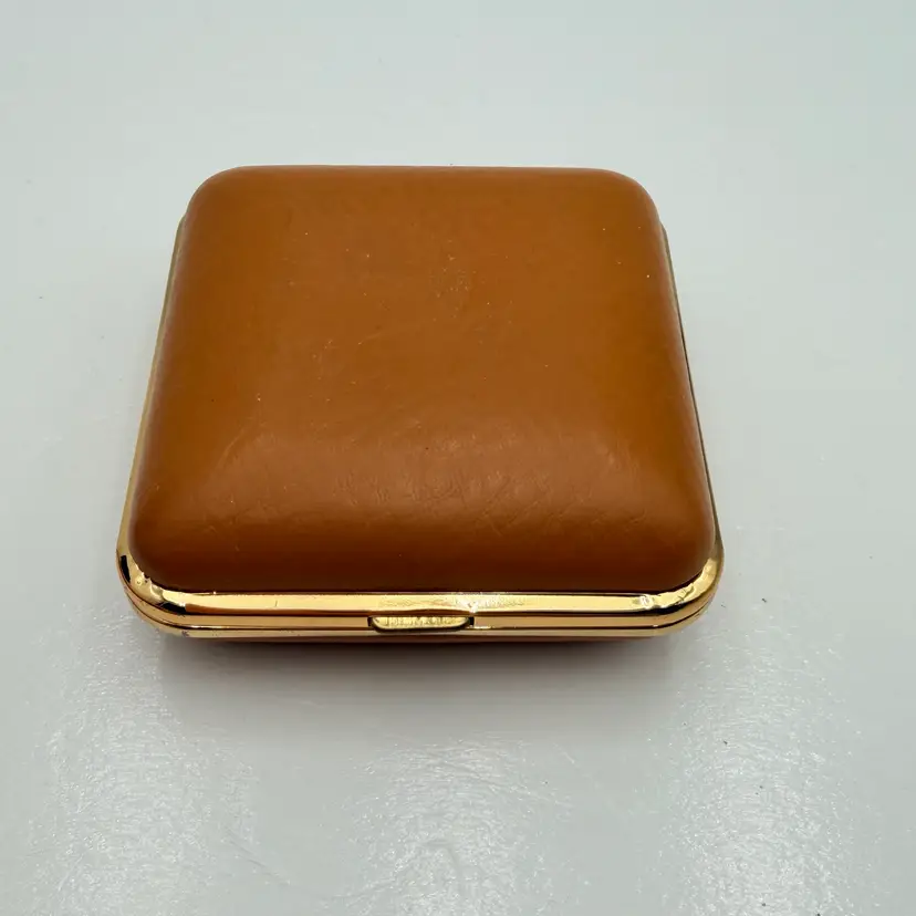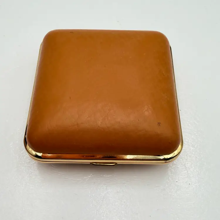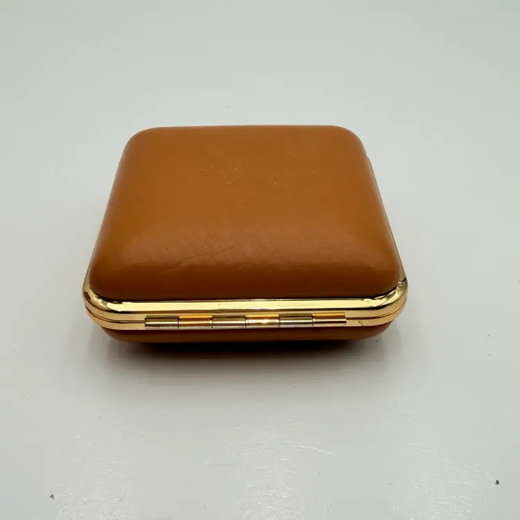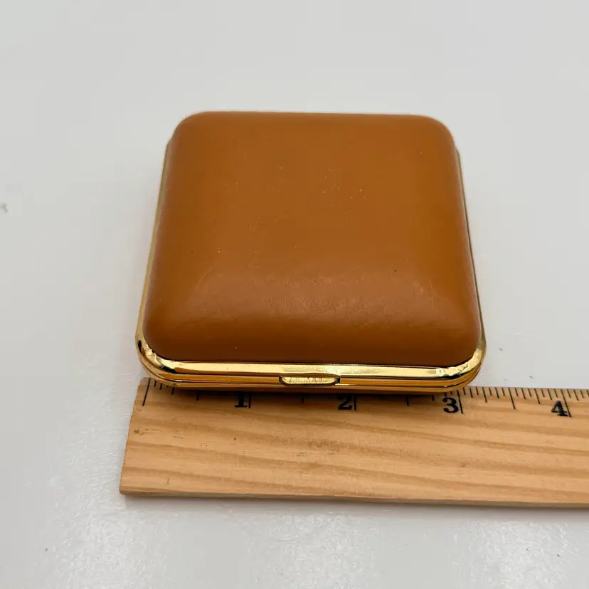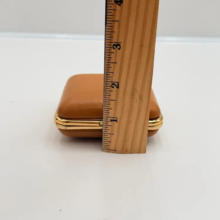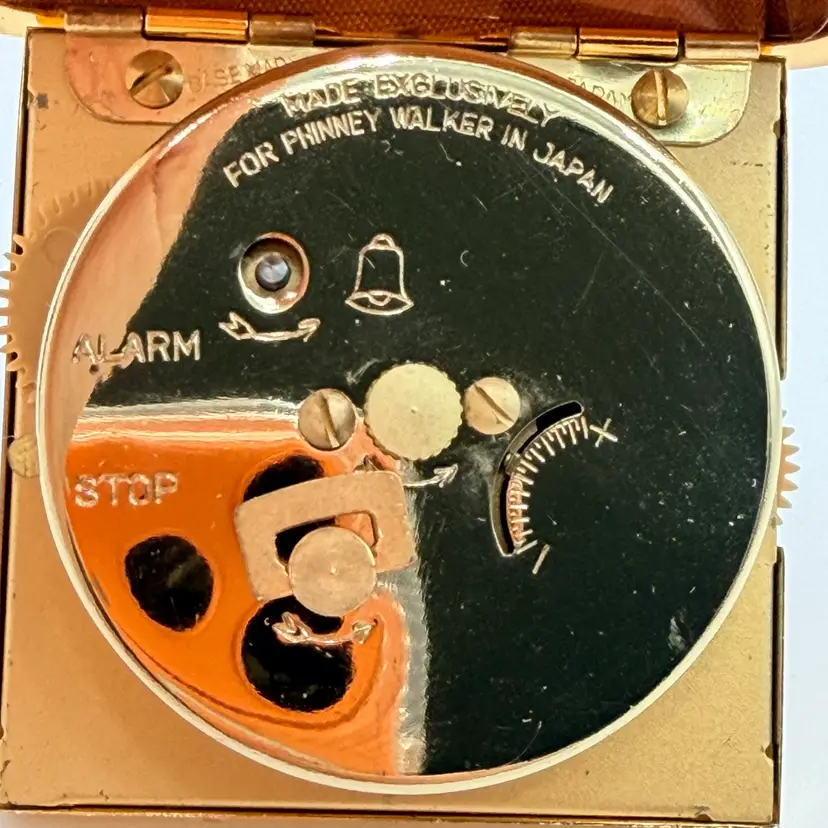 As shown 1.5 inches deep when folded by 3 inches wide Condition of the case and clock is very good. Not over wound and seems to work but not a clock expert. As is condition