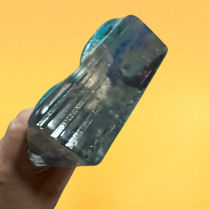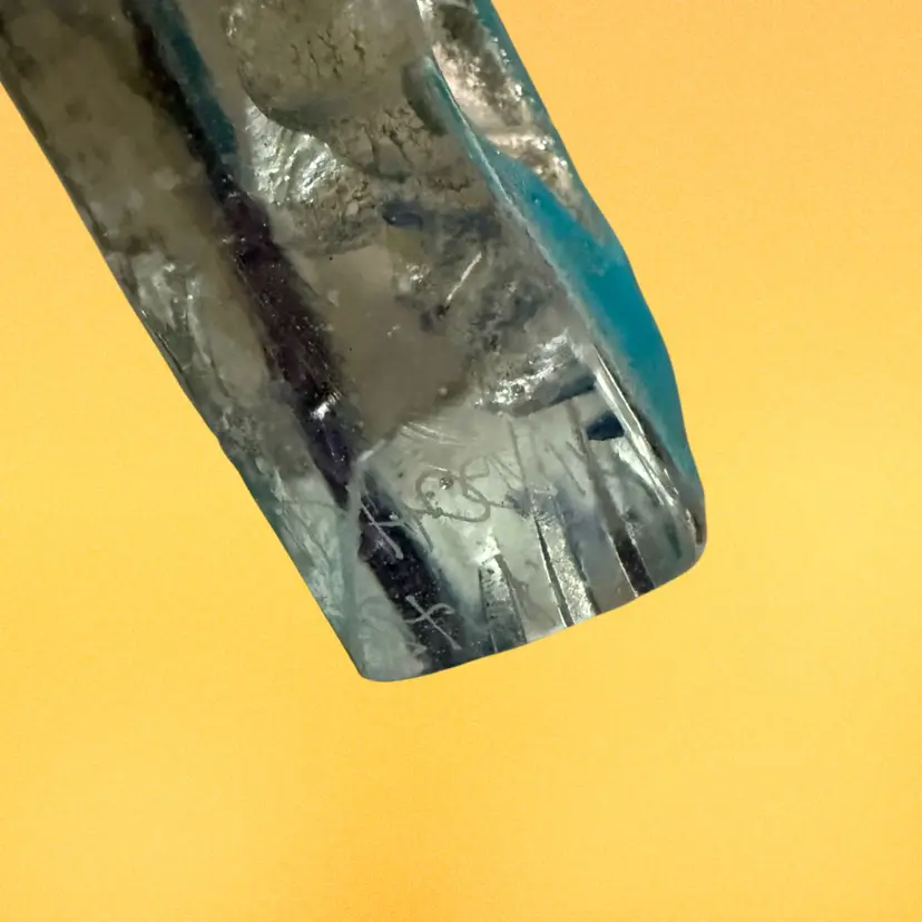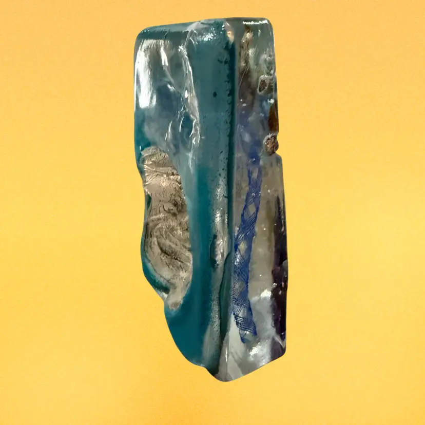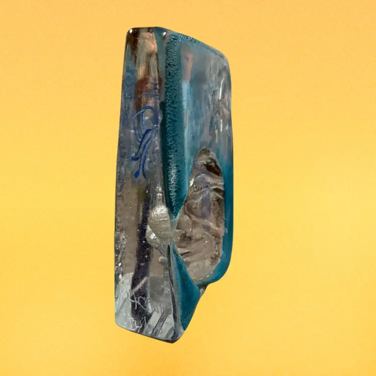 This art glass face sculpture is by Susan Gott of Phoenix Studios. The face appears to be the man in the moon, although she often depicted Buddha. It measures approximately 7” tall and 5” wide.