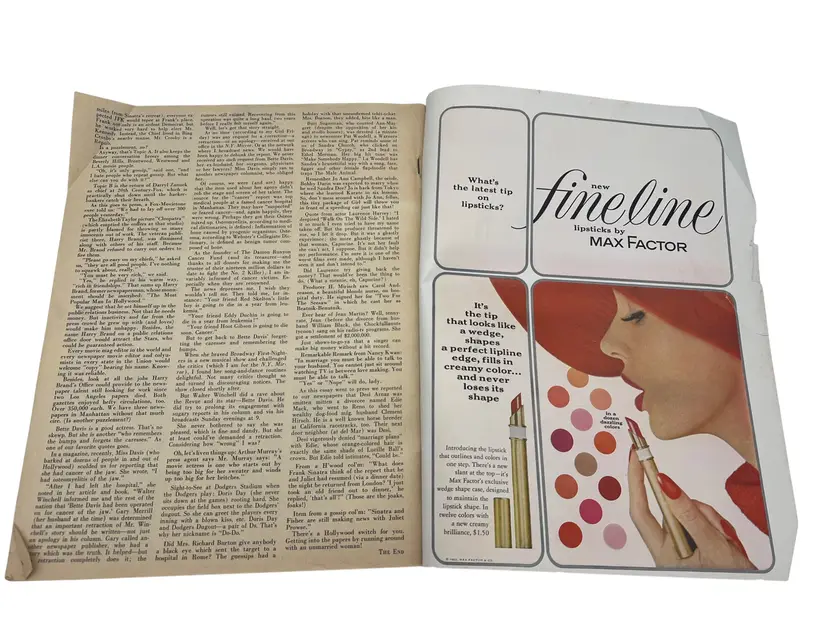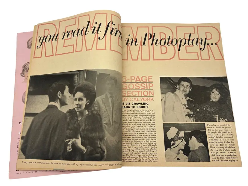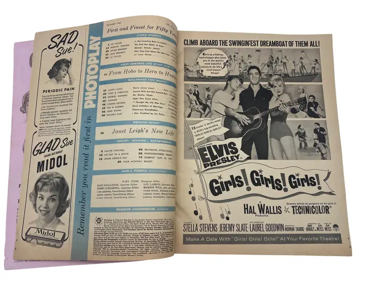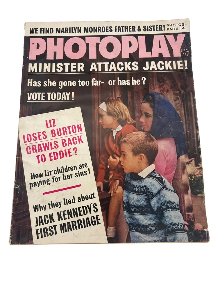 A vintage December 1962 issue of Photoplay magazine featuring Elizabeth Taylor on the cover, an article on Marilyn Monroe's family, photographs, and advertisements. A nostalgic collectible for mid-century pop culture enthusiasts. The magazine measures approximately 11" x 8.5".