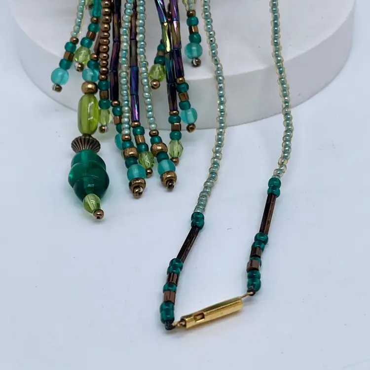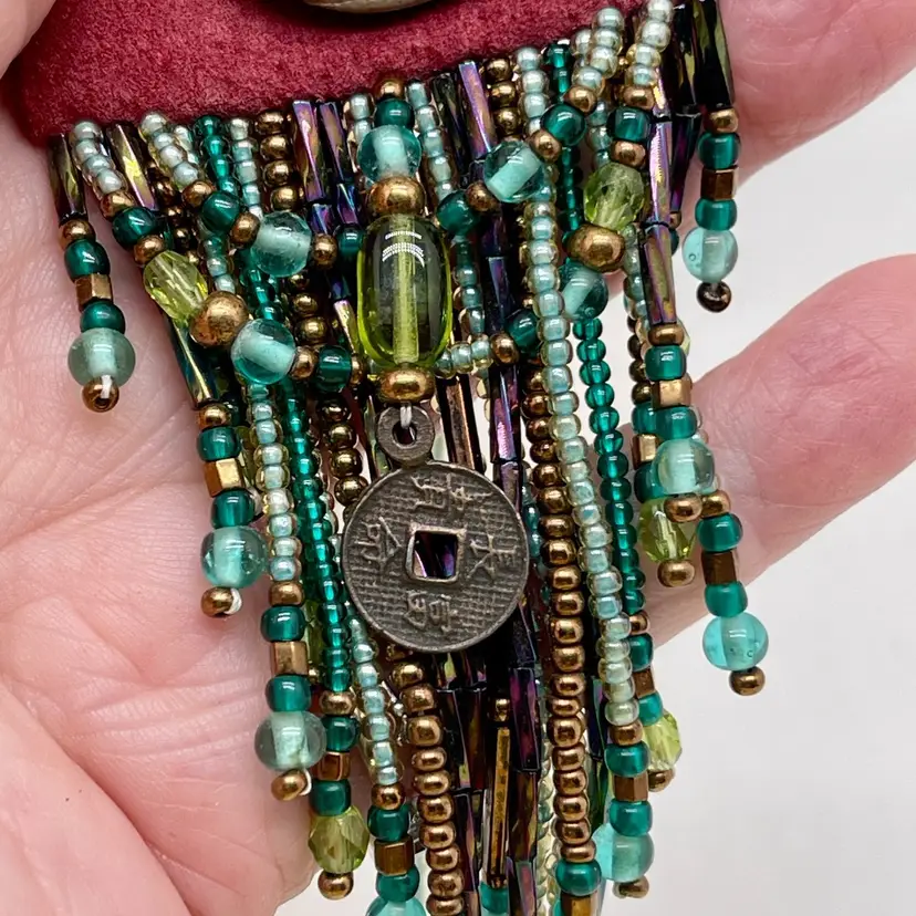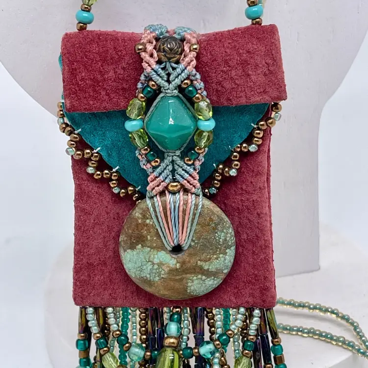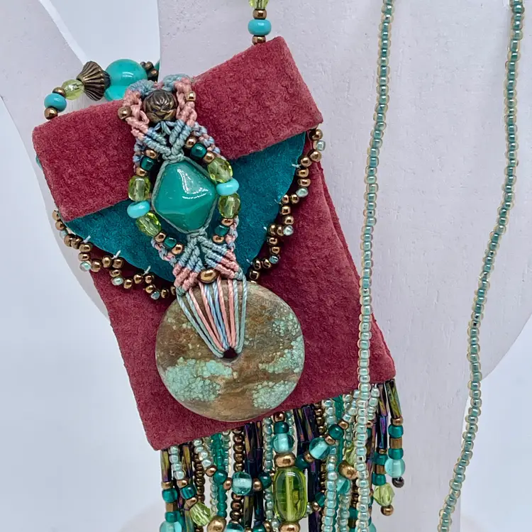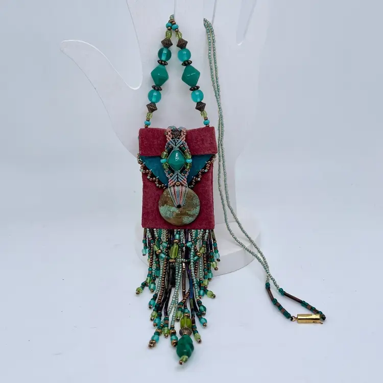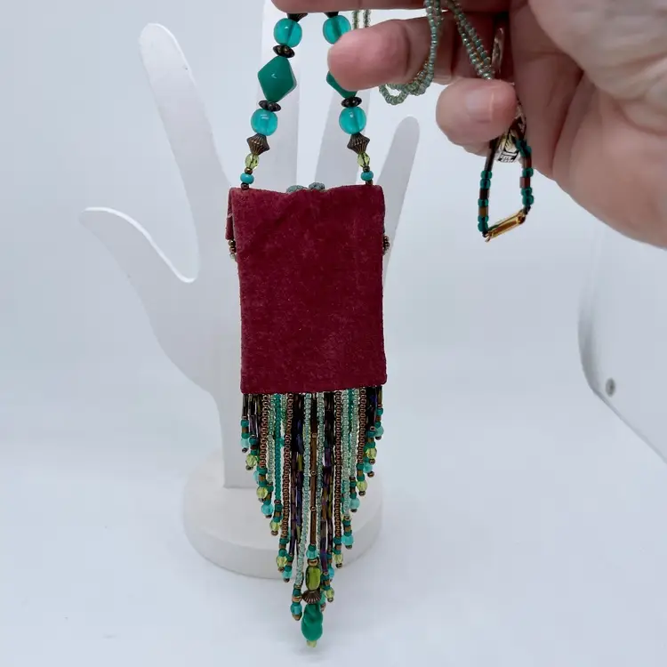 This is the coolest Boho, retro 70s necklace. The seed beads are so very delicate! The pocket is constructed with a felt-like material and encrusted with beaded fringe and stone. It's long! Hangs beautifully.