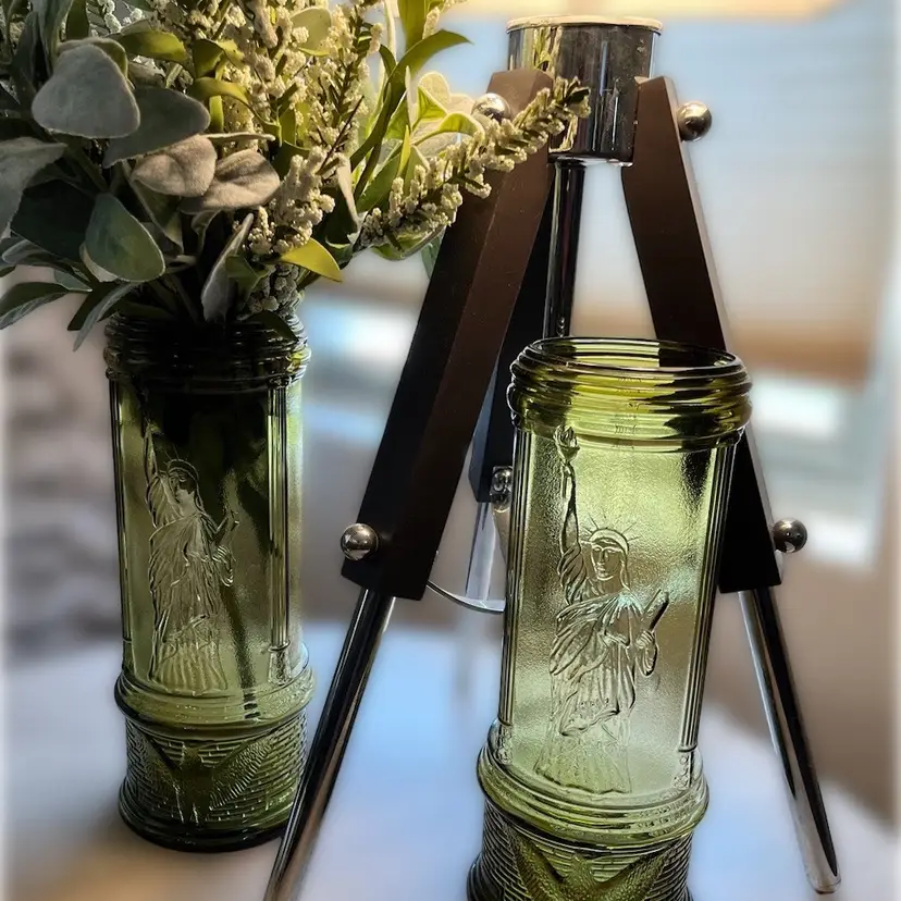 Two avocado green Pickle Jars featuring The Statue of Liberty & eagle Possibly goofus glass from the depression era. 12 in tall x 4 in diameter $30 each or both for $50