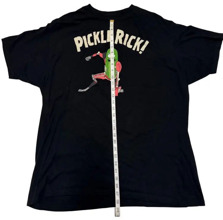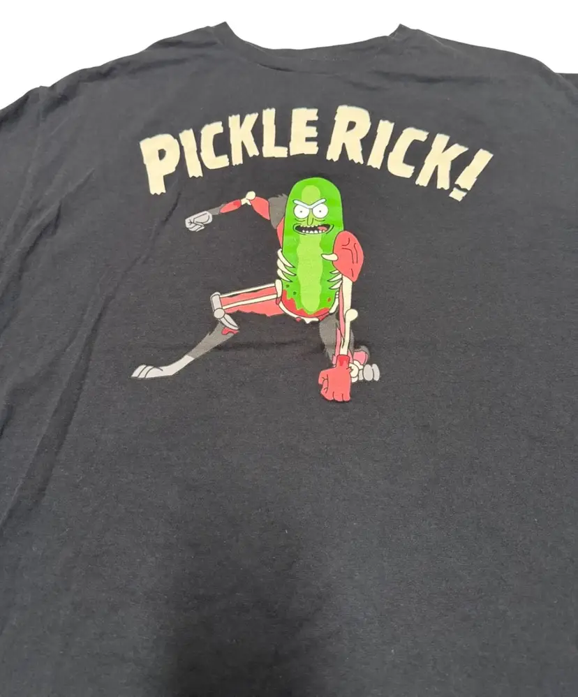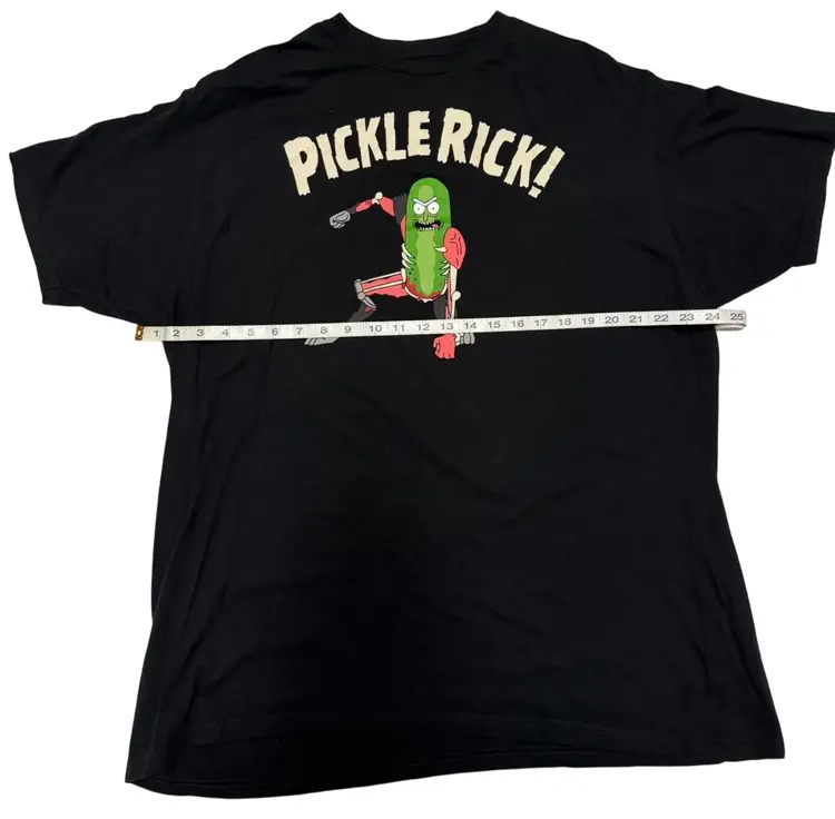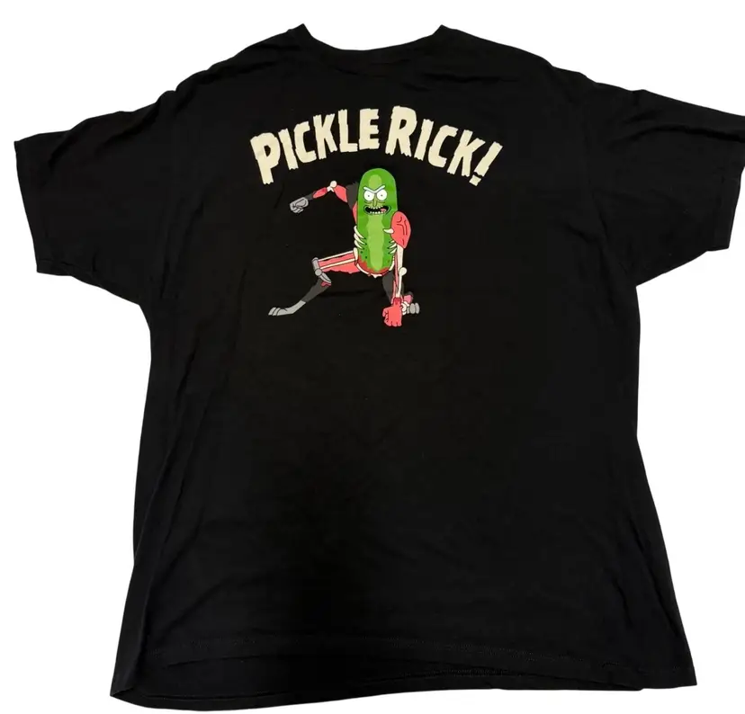 The Pickle Rick Action Pose Black Graphic Print Men's T-Shirt in 2XL by Adult Swim is a classic and funny addition to any wardrobe. Made of comfortable cotton material, this short sleeve t-shirt features a crew neck and a bold graphic print of the Pickle Rick character. Perfect for all seasons, this shirt is easy to care for and suitable for both men and women. Show off your love for the iconic Rick & Morty character with this unique and humorous tee.