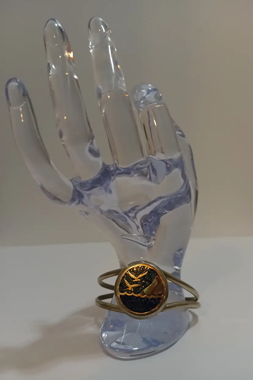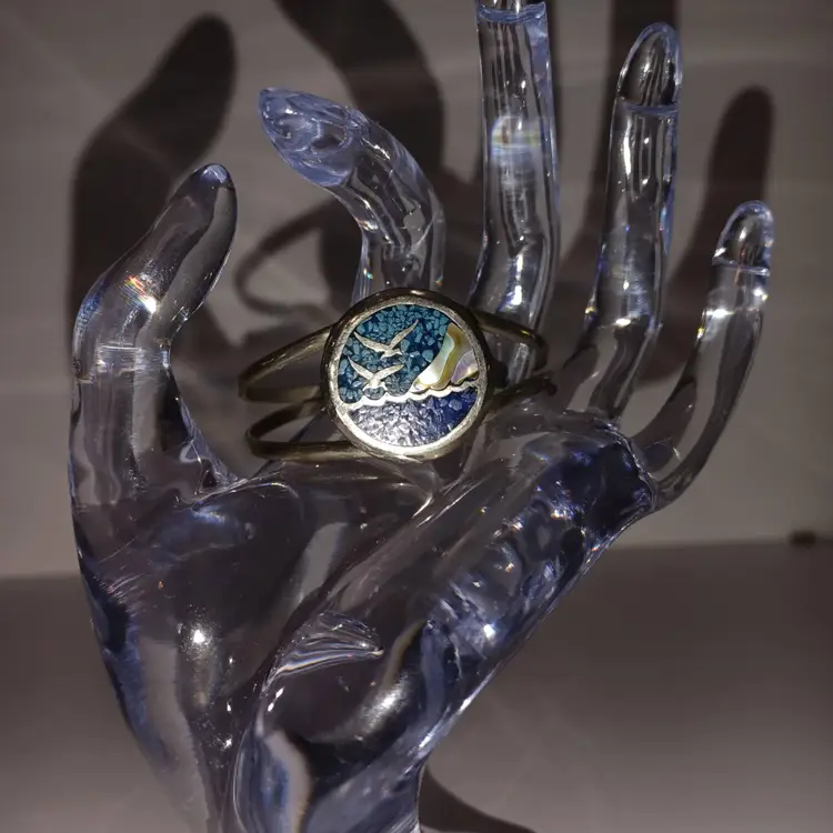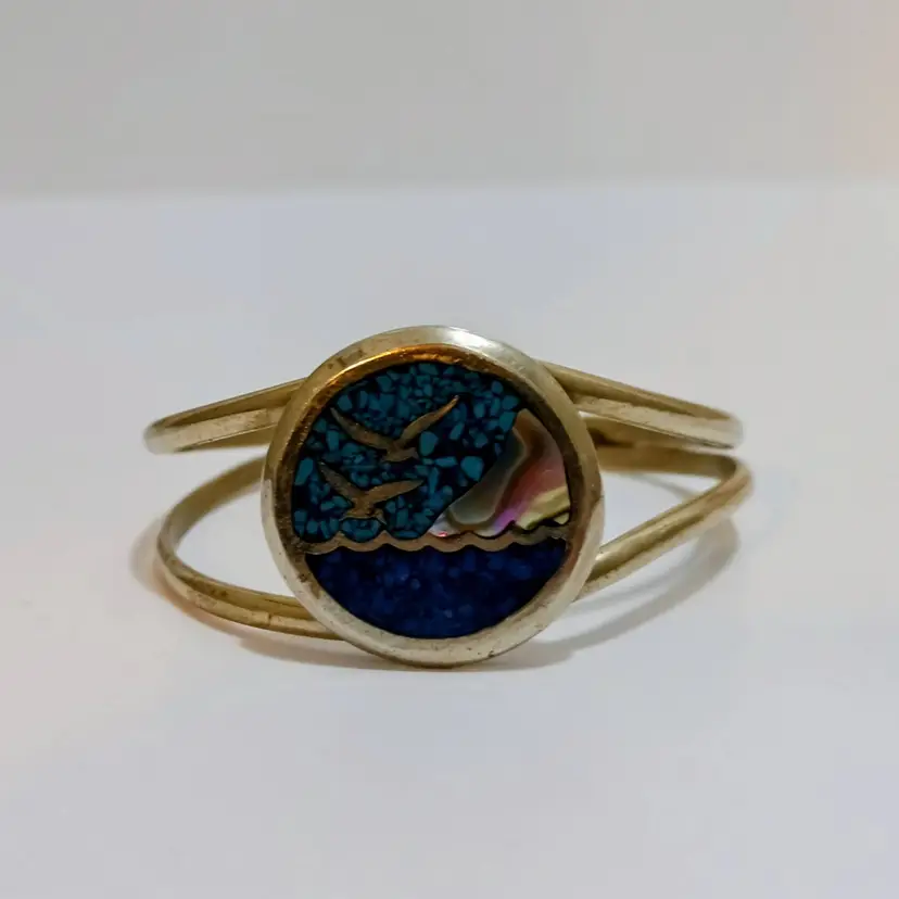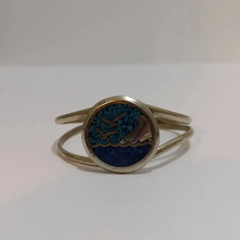 Beautiful Beach Scene of 2 Seabirds Flying Over The Ocean Created Out of Turquoise, Abalone, Lapis & Silver! A Different Kind of Micro Mosaic Artistry! Adjustable too! Wearable Art! 6" L x 1" W