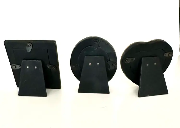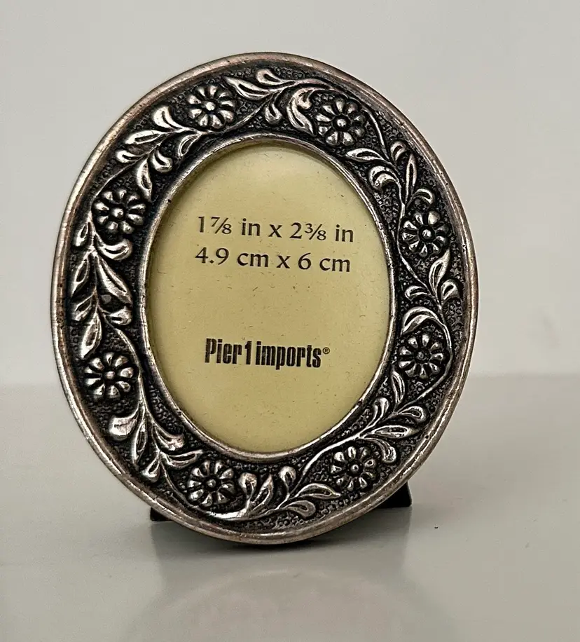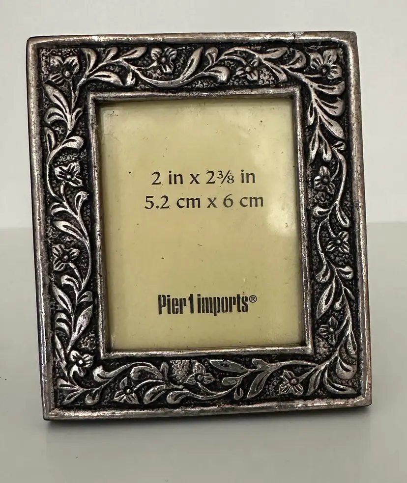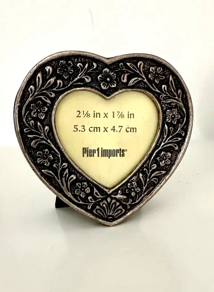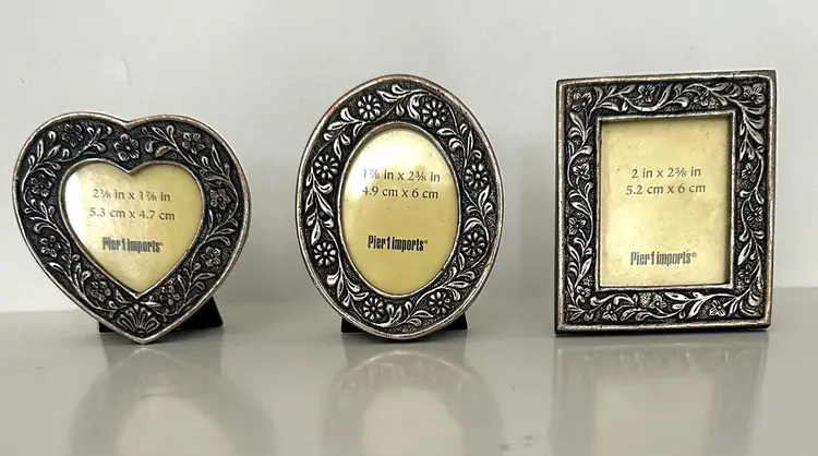 Add a touch of elegance to your living space with this stunning set of three mini frames from Pier 1.These frames come in a beautiful burnished etched floral surface, aged silver color that will complement any decor theme. Each frame is approximately 2-3 inches in height, length, and width, making them the perfect size for displaying your favorite photo. There is a heart, an oval, and a rectangle frame.Sizes are indicated on each.