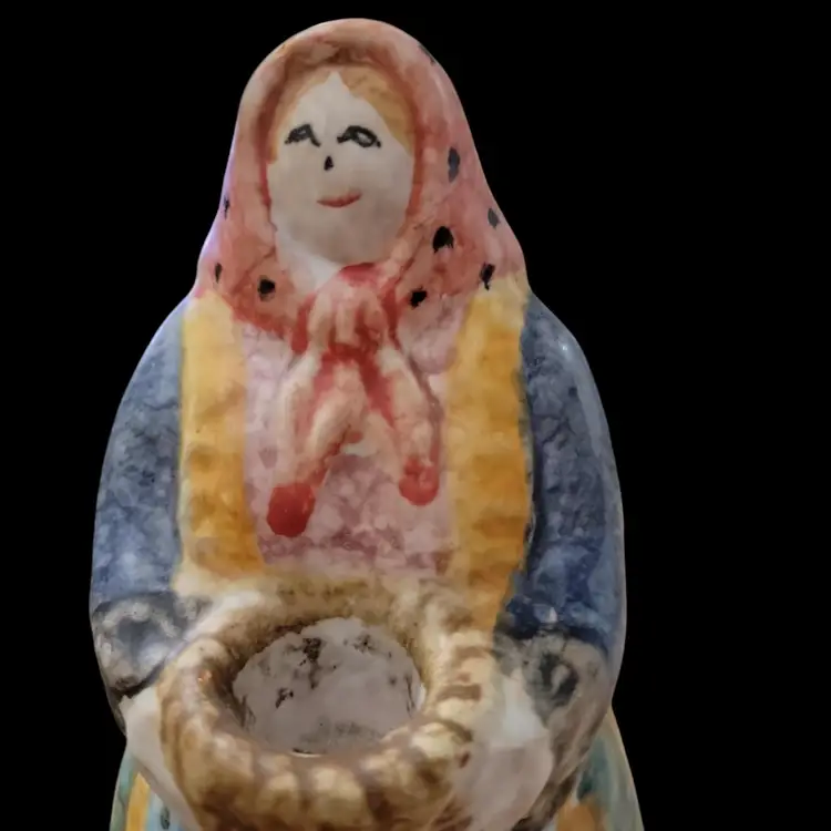 Add a touch of rustic charm to your home decor with this beautiful Pier 1 Imports 7" candle holder. The hand-painted multicolor ceramic design features a quaint country woman with a basket that holds a 1" candle, perfect for adding a cozy touch to any room. Made in Italy, this candle holder is a unique addition to your collection of decorative collectibles and is sure to impress. The finish is painted in fun colors and plaids making it an ideal gift for any woman who loves country decor.
