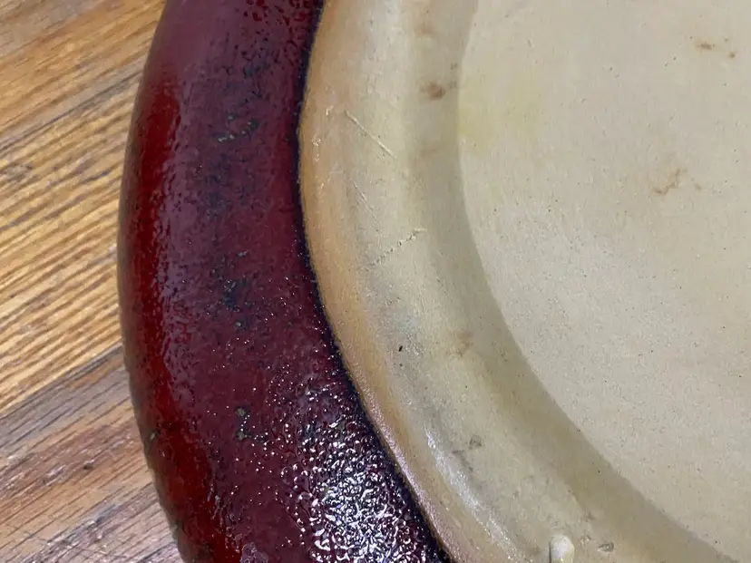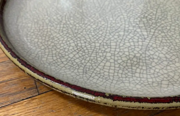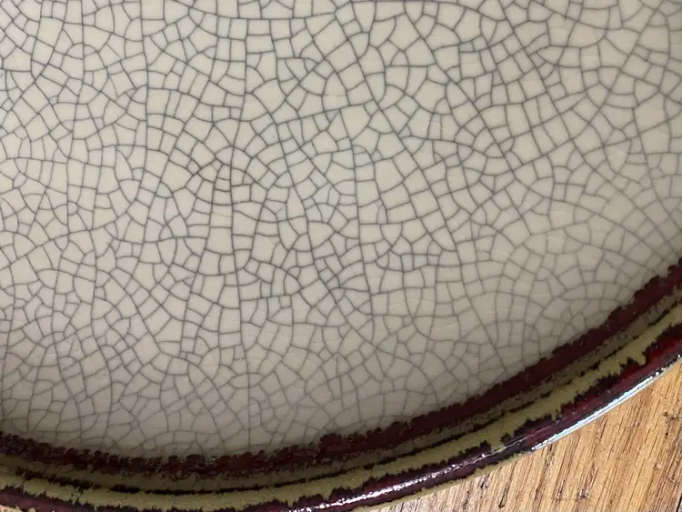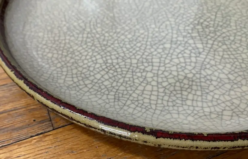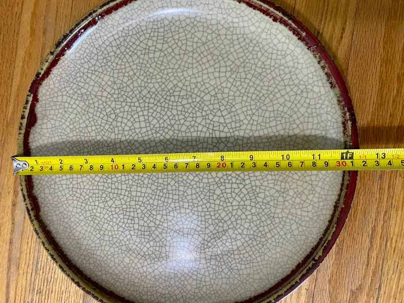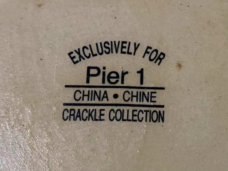 This is a vintage Pier 1 "Crackle Collection" Large Chop Plate measuring 12 inches in diameter. It is made of ceramic stoneware in a rust brown color with a multi-color crackle pattern. Add a touch of uniqueness and style to any dining table or kitchen decor.
