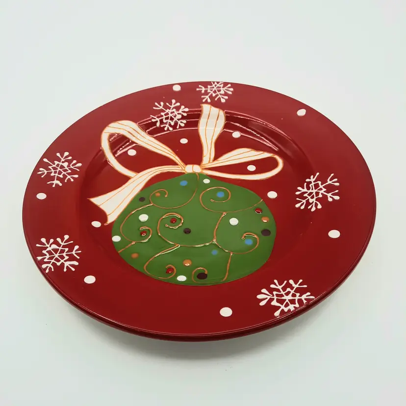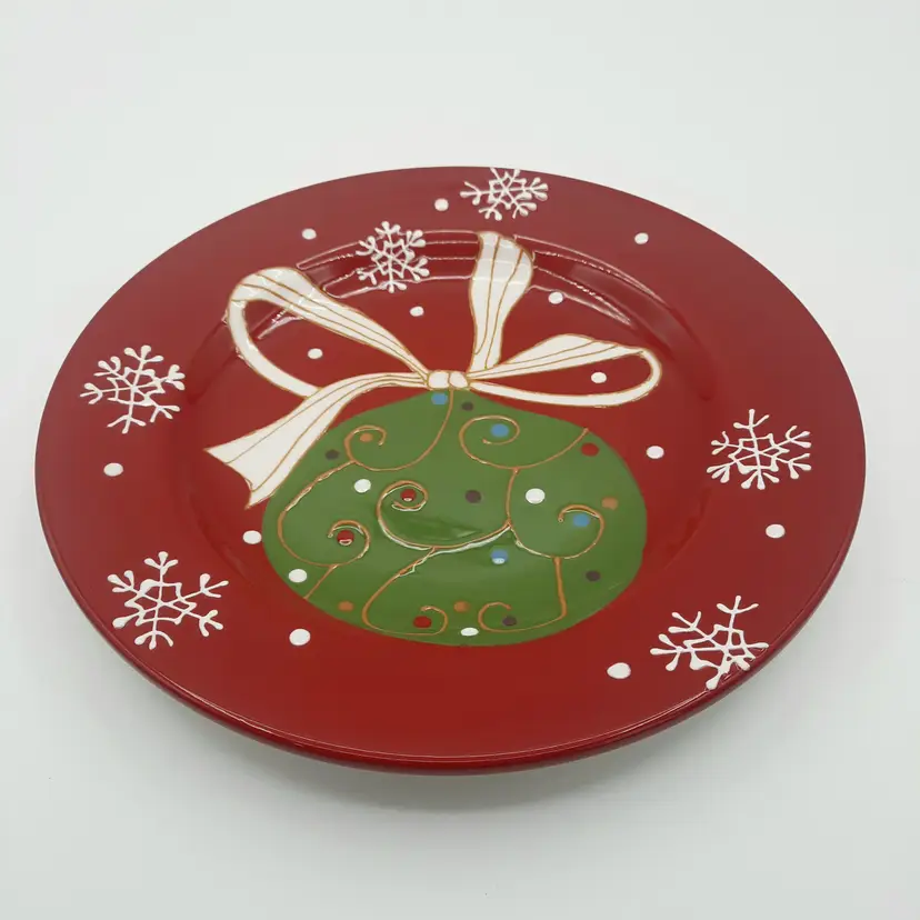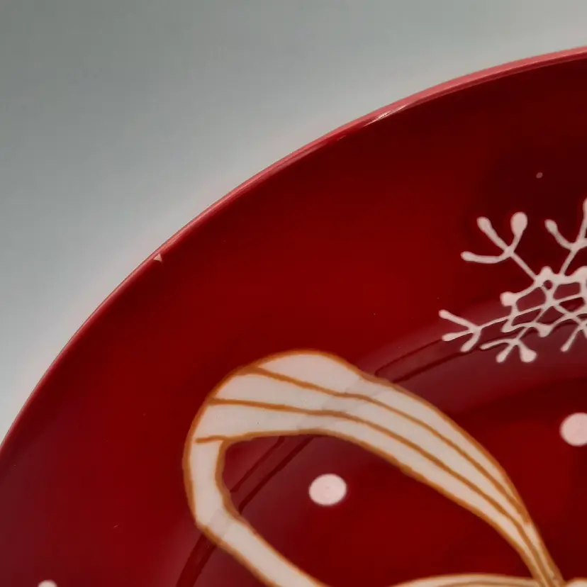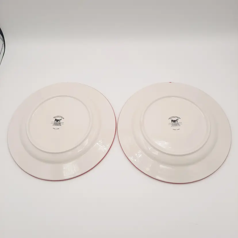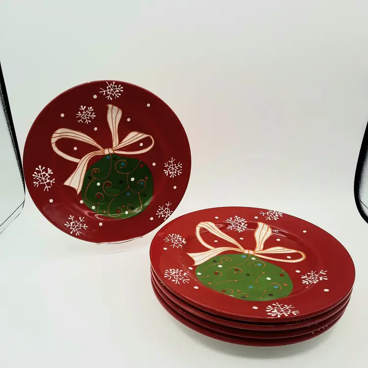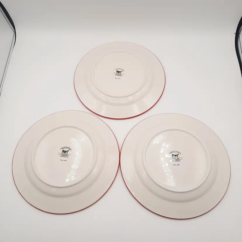 Beautiful set of 5 Pier One Christmas 8 1/2" salad/dessert plates (they are more of a bright Christmas red than pics show) in overall great condition - a few tiny paint chips/scuffs, small imperfections in glaze and light crazing on one plate