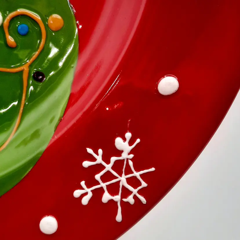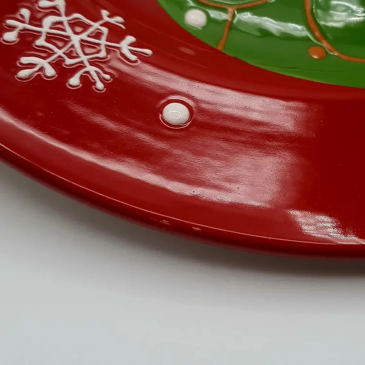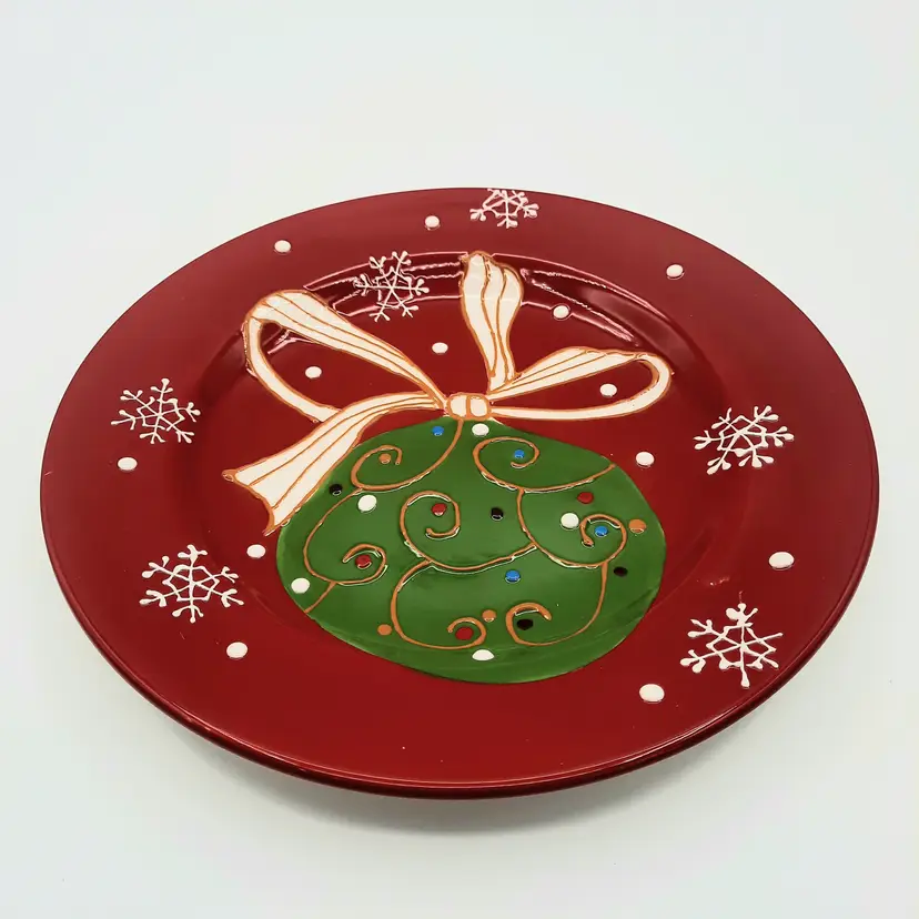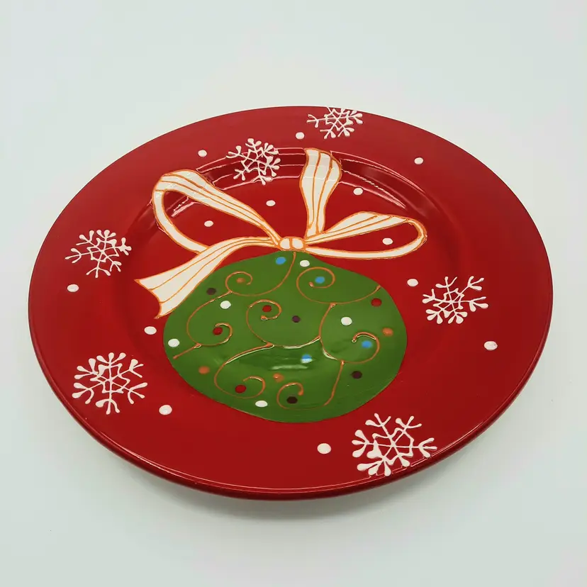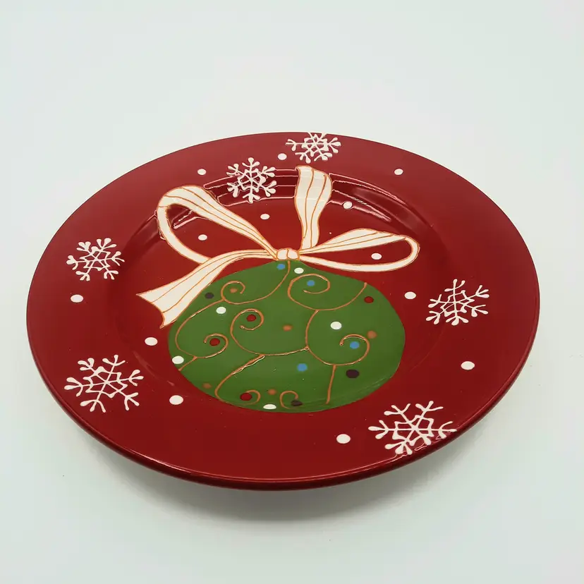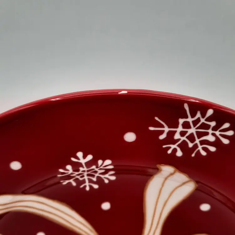 Beautiful set of 5 Pier One Christmas 8 1/2" salad/dessert plates (they are more of a bright Christmas red than pics show) in overall great condition - a few tiny paint chips/scuffs, small imperfections in glaze and light crazing on one plate