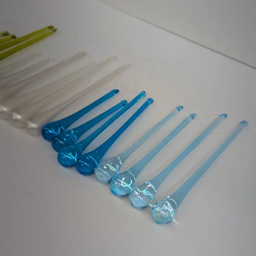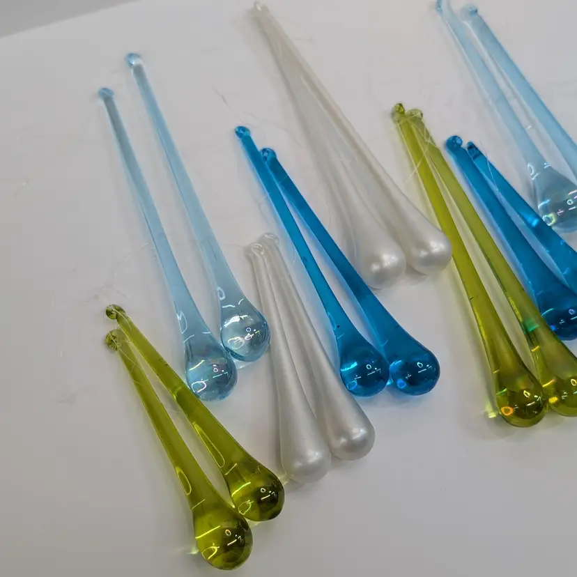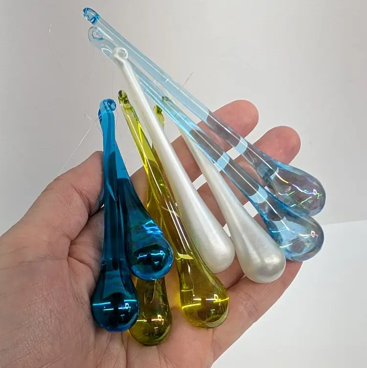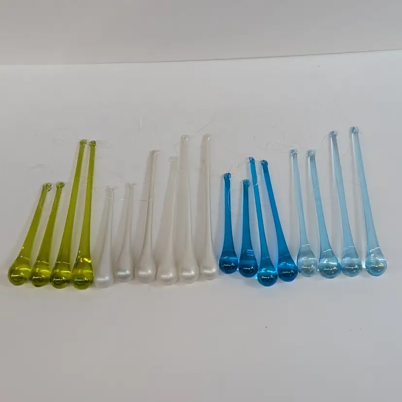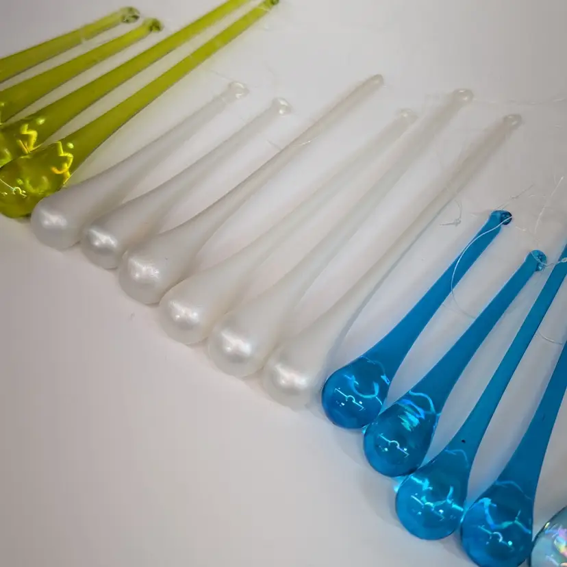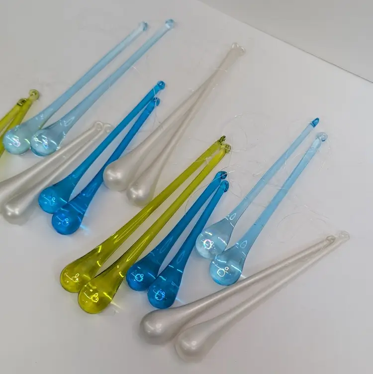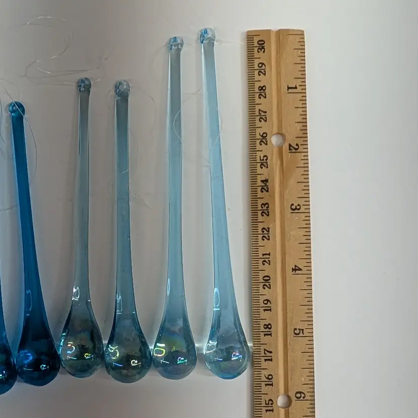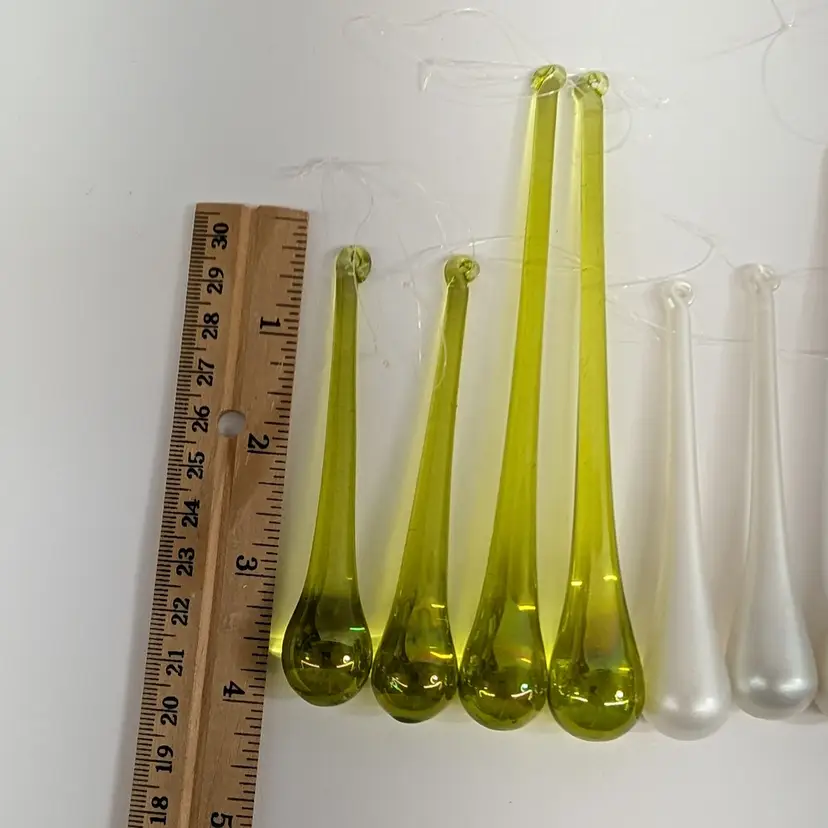 Two sets of Pier 1 Import glass icicle ornaments in green, white and blue glass. 18 total ornaments. There is some iridescence and almost pearl-like sheen on the white. They all have fishing line hangers and are in nice, used condition. Measurements ~ 3.5 to 5.5"