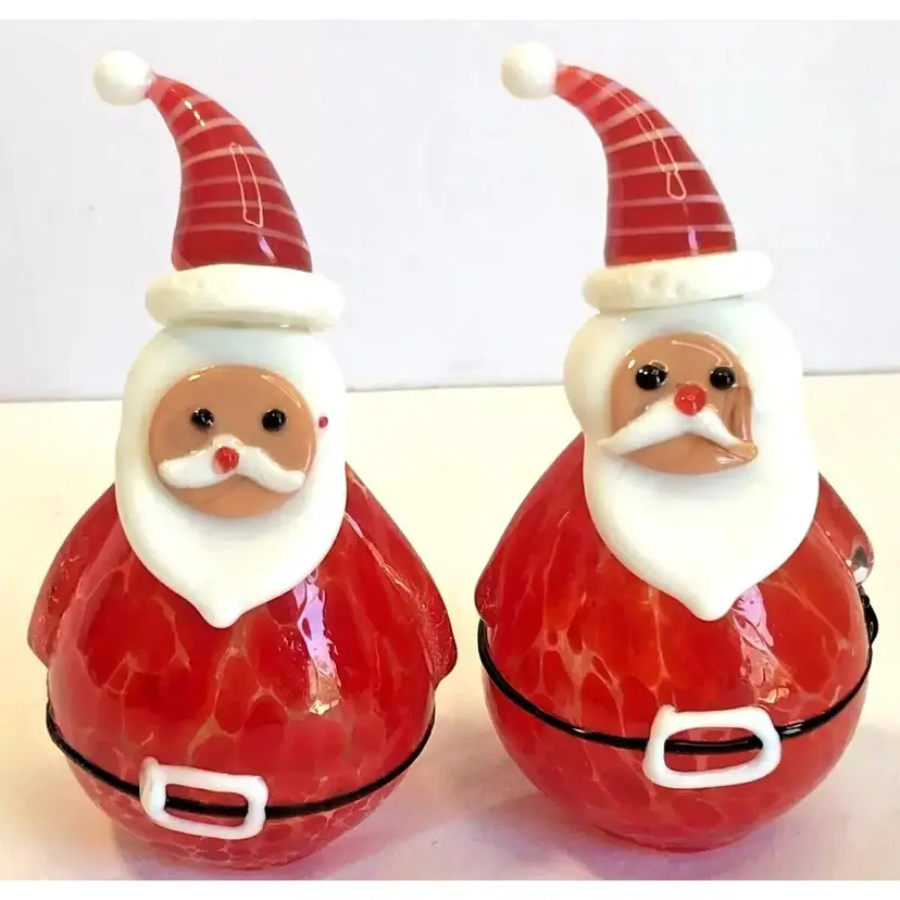 Pier 1 Handmade Red Art Glass Santa Claus Salt &Pepper Shakers Christmas Vintage. About 4" tall. Crack as shown on one hat.
