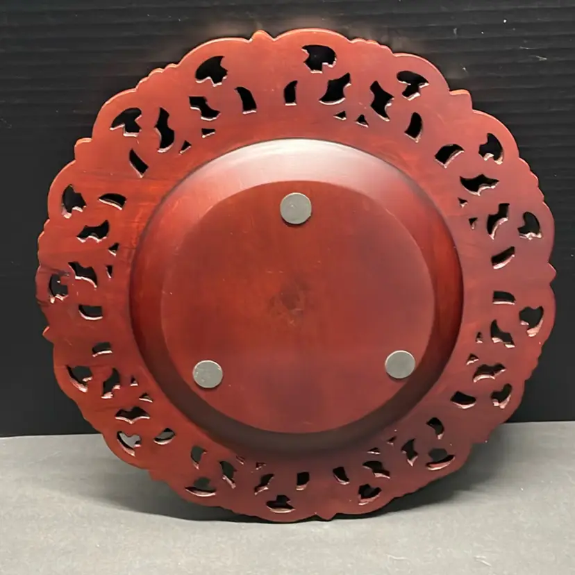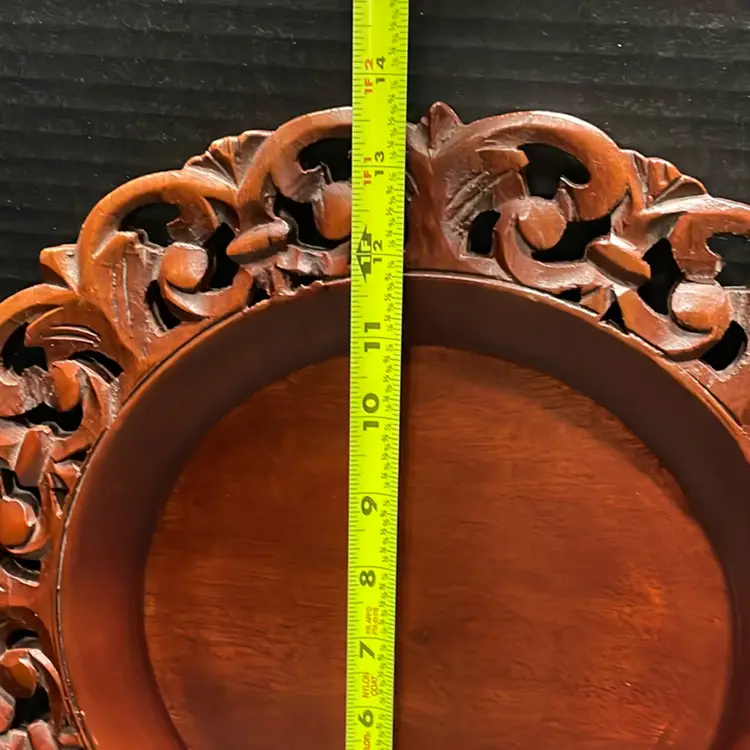 Dimensions: These chargers typically have a diameter of around 13 inches. Material: It is made of wood, often described as acacia, mango wood, or rosewood, with a dark brown stained finish.