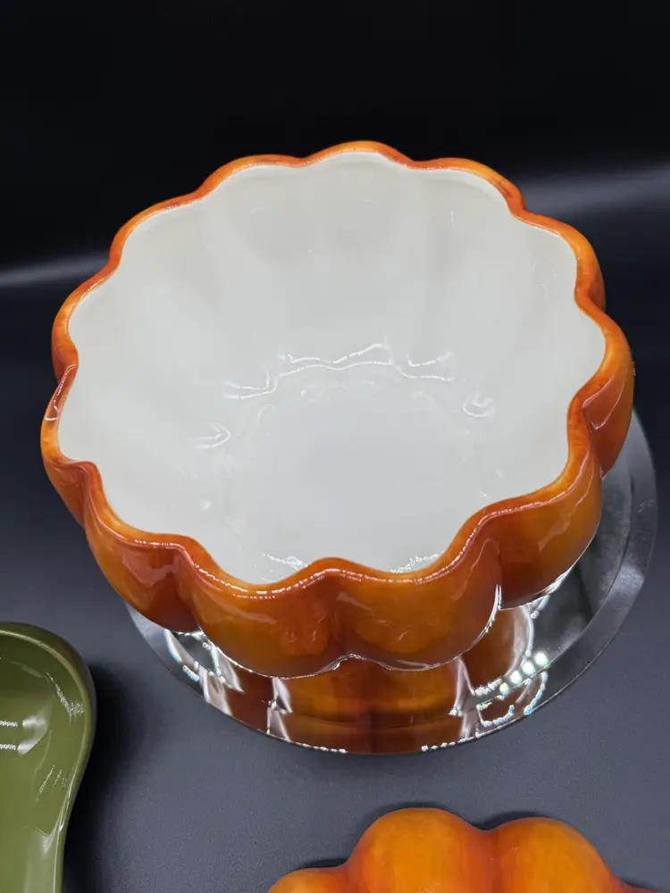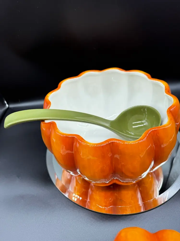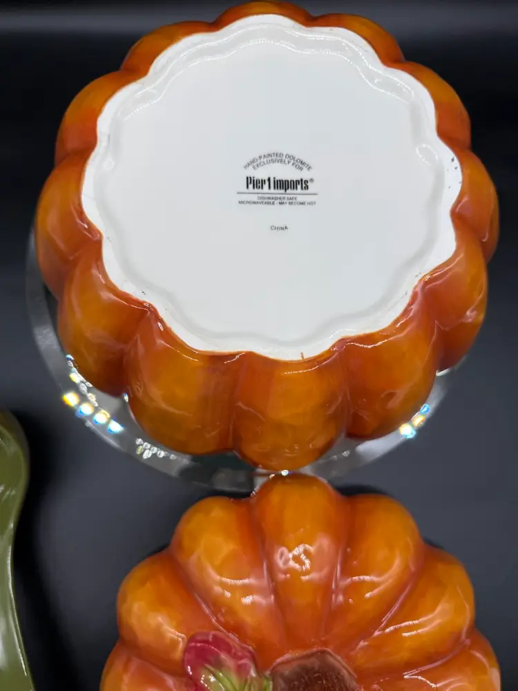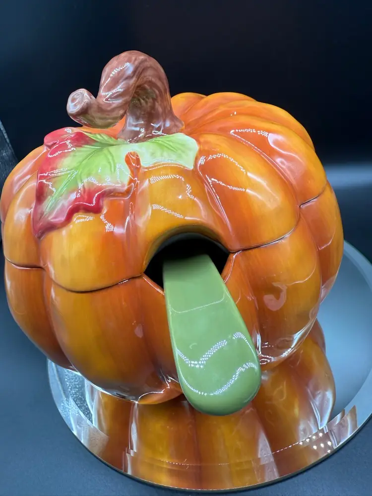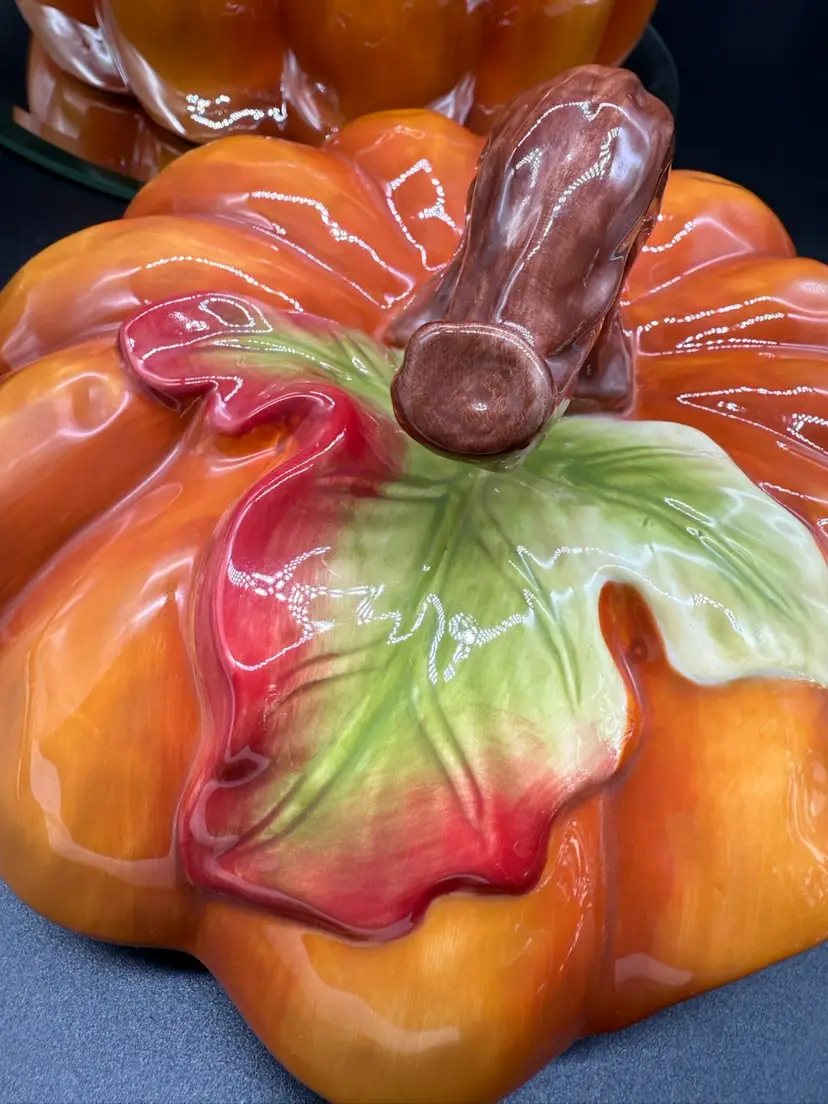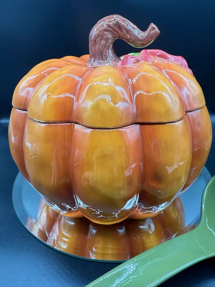 One Pumpkin with Stem and Leaf Lidded Tureen with Original Ladle-- Orange brown green and red Fall Decor/Thanksgiving/ Halloween, Lovely Centerpiece