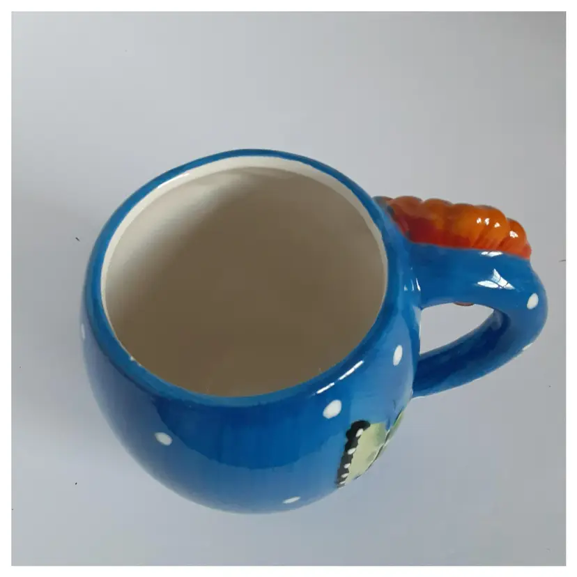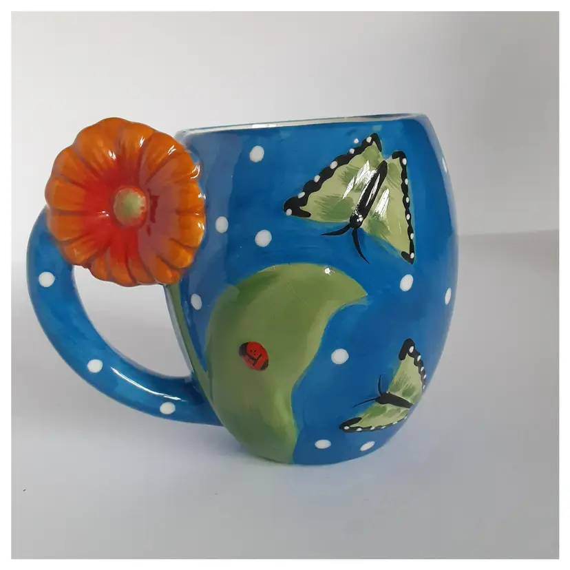 Royal Blue mug with polka dots, raised flower, butterfly and ladybug. This is a good-sized mug, perfect for your morning coffee or tea. This mug just makes you think of spring and summer! It measures 4 1/2 inches tall and 6 inches wide including the handle.