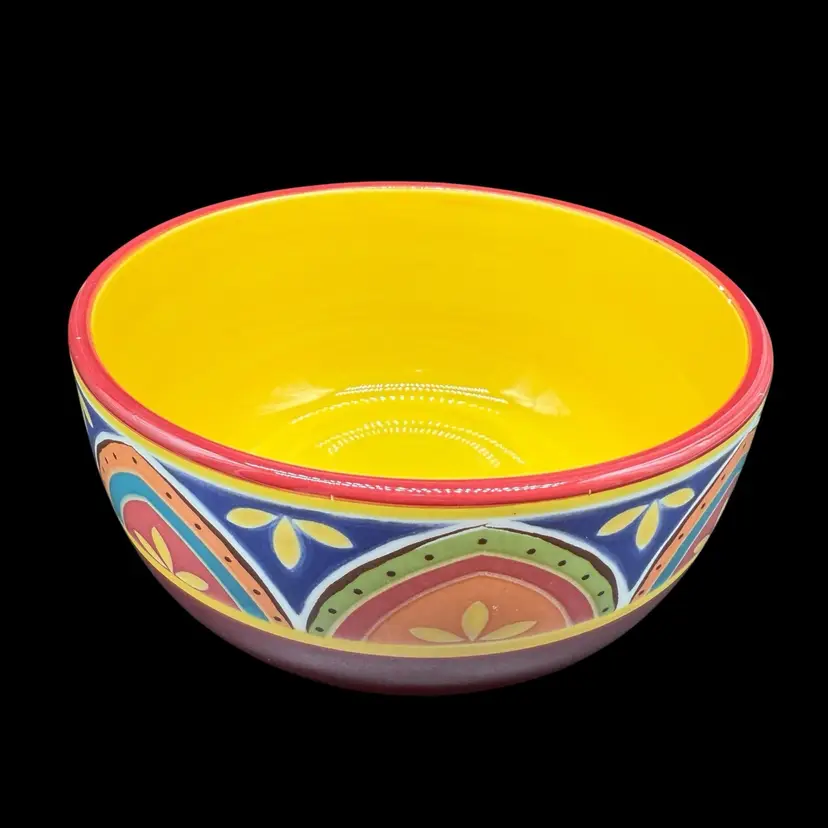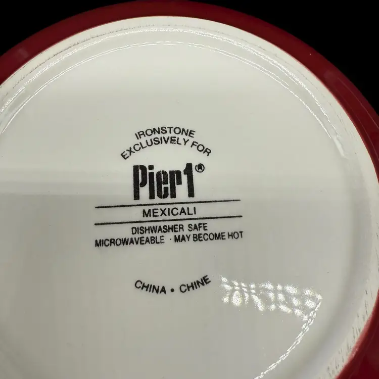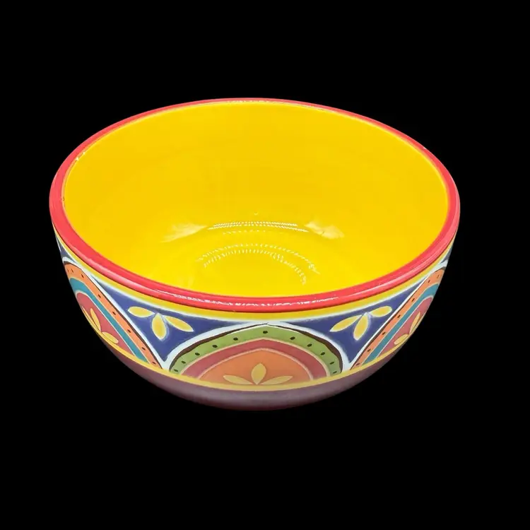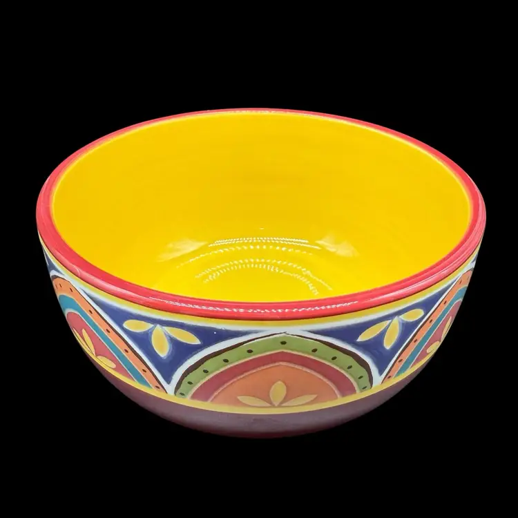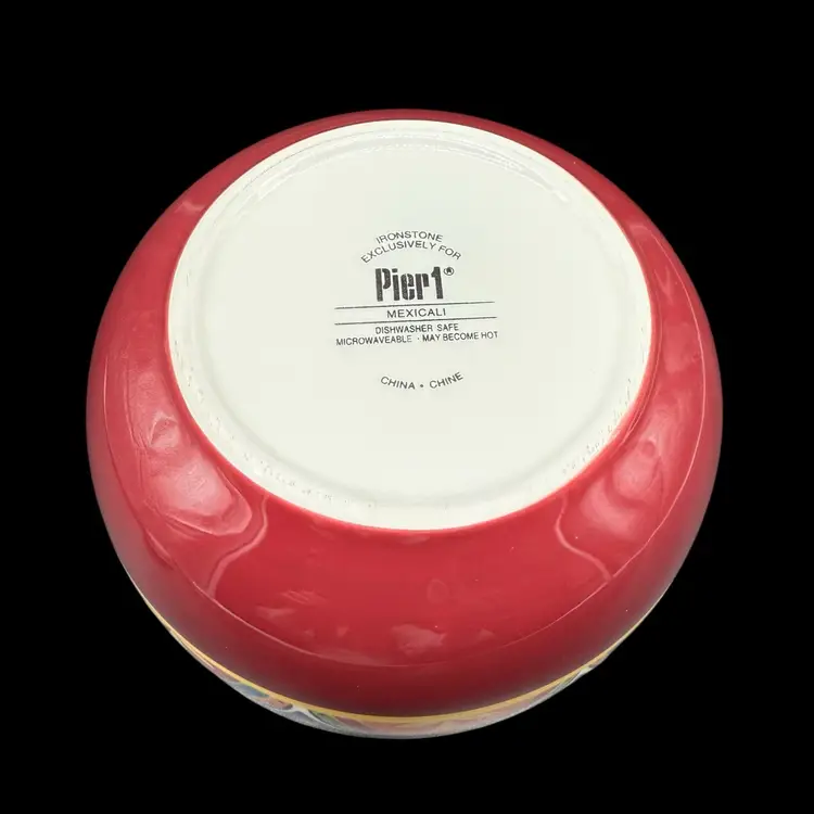 The Pier 1 Imports Ironstone Mexicali Floral Cereal Bowl is a colorful and decorative stoneware bowl featuring a vibrant floral pattern. This contemporary style bowl by Pier 1 Imports is microwave and dishwasher safe, making it a practical and stylish addition to any kitchen or home collection. Perfect for all occasions, this multicolored bowl is a unique and eye-catching item.