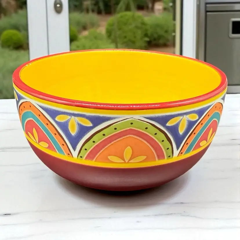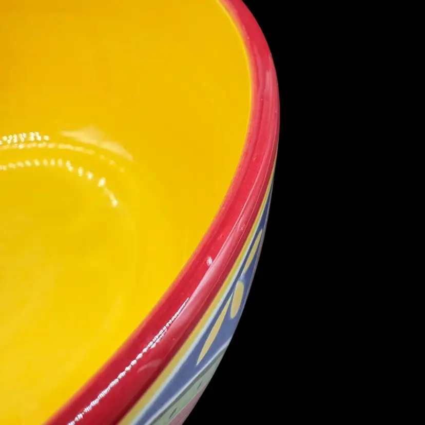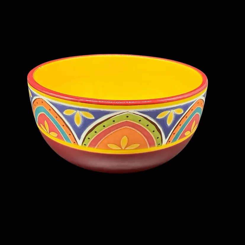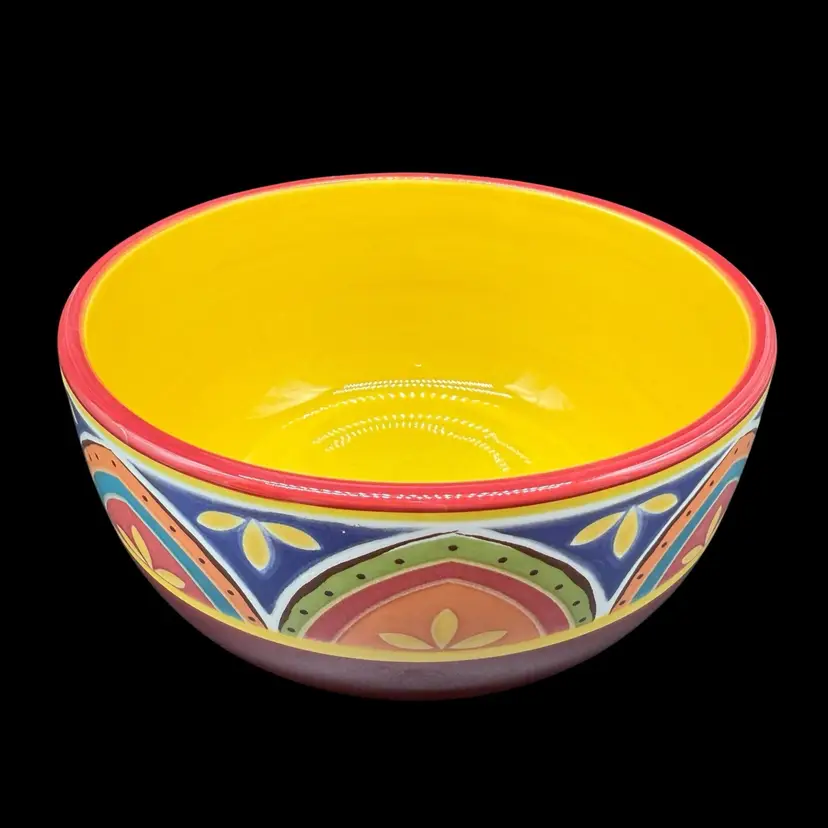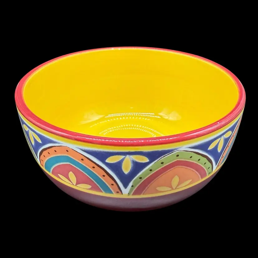 The Pier 1 Imports Ironstone Mexicali Floral Cereal Bowl is a colorful and decorative stoneware bowl featuring a vibrant floral pattern. This contemporary style bowl by Pier 1 Imports is microwave and dishwasher safe, making it a practical and stylish addition to any kitchen or home collection. Perfect for all occasions, this multicolored bowl is a unique and eye-catching item.
