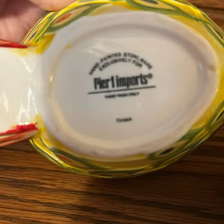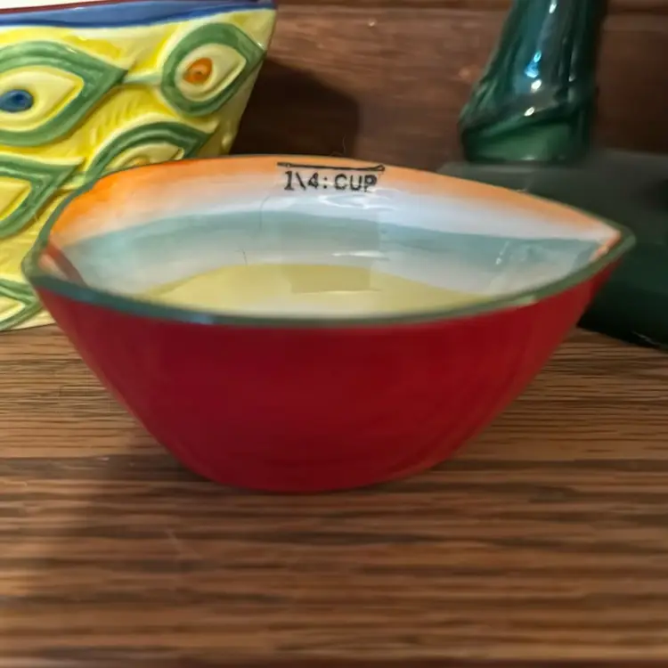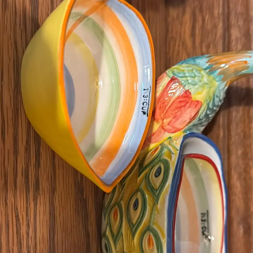 Beautiful set of pier 1 measuring cups includes one cup,1/2 cup,1/3rd cup and 1/ 4 of a cup. No chips or cracks .